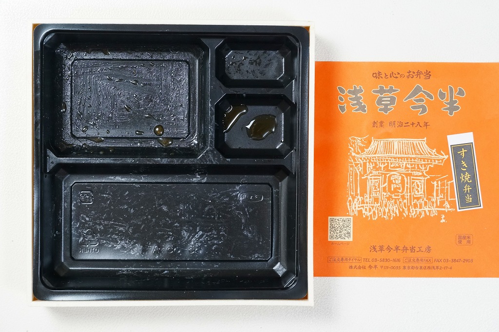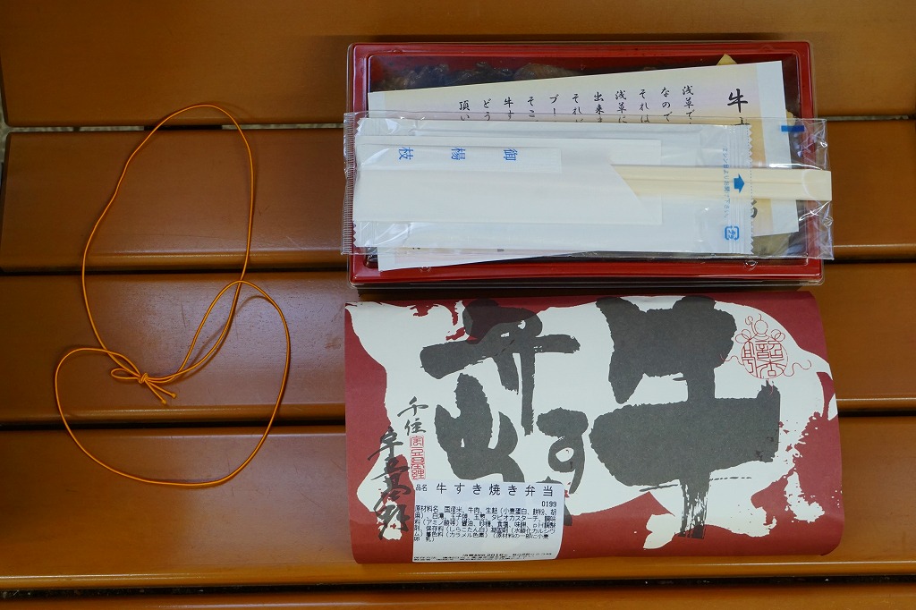 2012(平成24)年の発売か。掛紙や添付のチラシで「牛すき弁当」、食品表示ラベルで「牛すき焼き弁当」、売店の掲示で「浅草牛すき弁当」と名前が異なる。長方形の容器に白御飯を詰め、割り下で真っ黒になった牛肉煮で覆い、タマネギ、シラタキ、玉子焼、お麩を添えたり散らすもの。明治の初め頃に浅草で牛鍋屋が一時的なブームになったことにちなみ、この駅弁ができたという。常温で昼飯にモリモリ食べられる牛鍋丼。調製元の2017年頃の撤退により、今は売られていないはず。