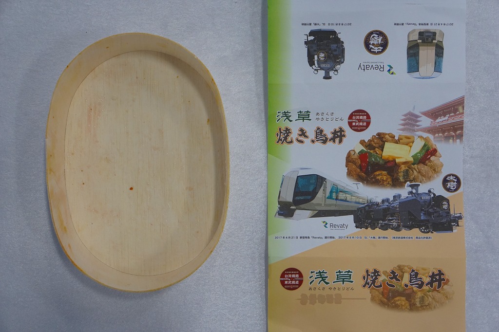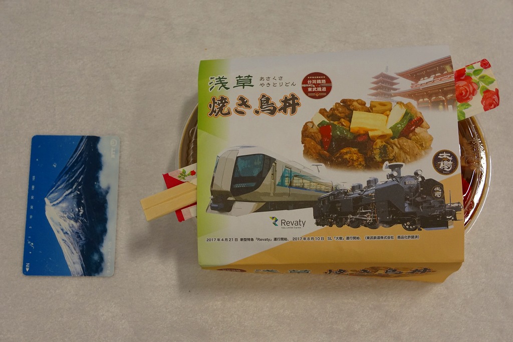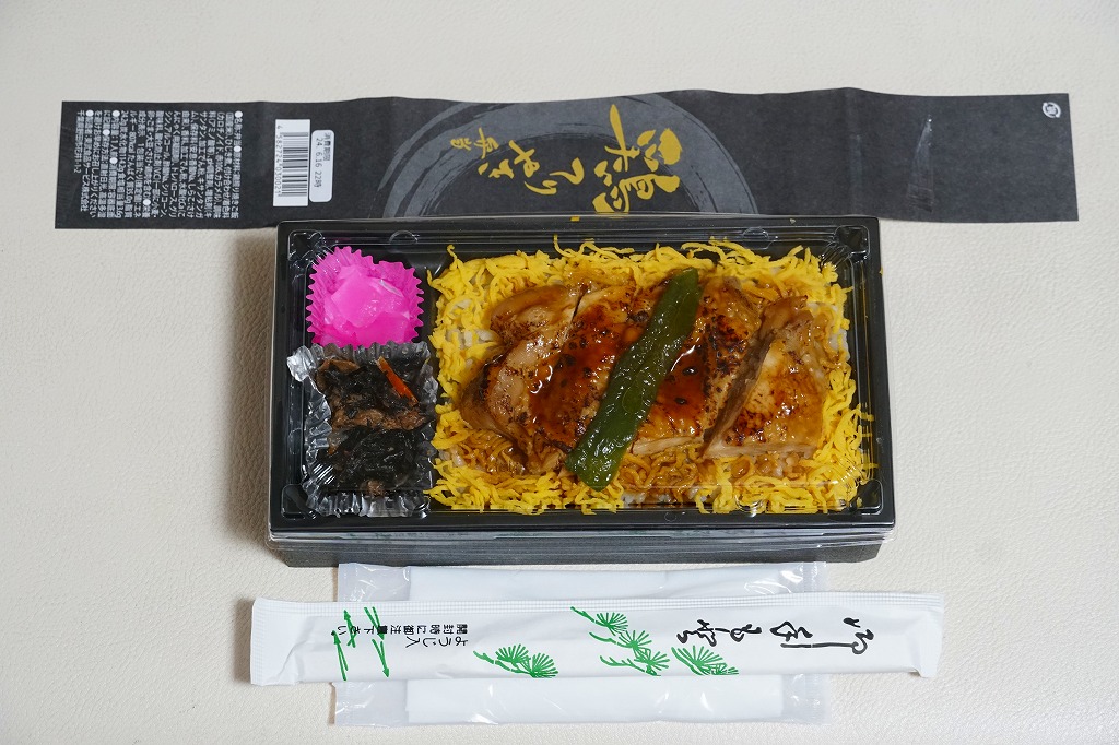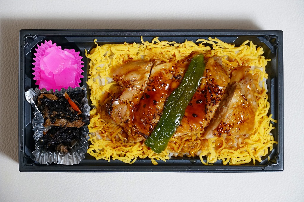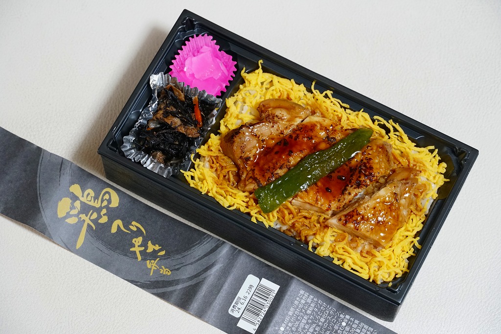 2023(令和5)年までに東武鉄道の浅草駅で発売か。商品名を書いた黒い紙帯を締める、長方形のプラ容器に白飯を詰め、錦糸卵で覆い、タレをまとう鶏照焼のひとかたまりを5切れにカットして載せ、ピーマン焼きで彩り、ひじき煮と大根桜漬を添える。デパ地下の惣菜弁当のようなもの。調製元とその所在地から、東武鉄道系列のゴルフ場その他施設で食堂や売店を運営する東武鉄道の子会社が、千葉県野田市で運営するホテル「ビジネスホテル野田」で製造する弁当だろうか。駅のホーム上でそば・うどんでなく立ち食いラーメンを提供することで鉄道ファンに驚かれる「東武らーめん」の運営元でもある。