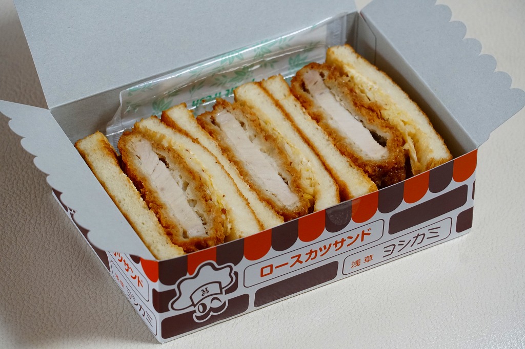 商品そのものは、その各地のものと同じ。1951年に浅草で創業した老舗の洋食店のブランドネームとキャラクターを描く専用の紙箱に、透明なプラ製トレーに収めてフィルムで密封したカツサンドが3切れ。焼いた食パンに豚ロースカツのソース漬けと自家製コールスローを挟む。ほどほどに柔らかく歯応えのあるカツサンドだと思う。コンビニサンドとこういった商品の進出により、昔からの駅弁屋は2000年代にはほとんどサンドイッチを作らなくなった。この商品の調製元は羽田空港の空弁屋。