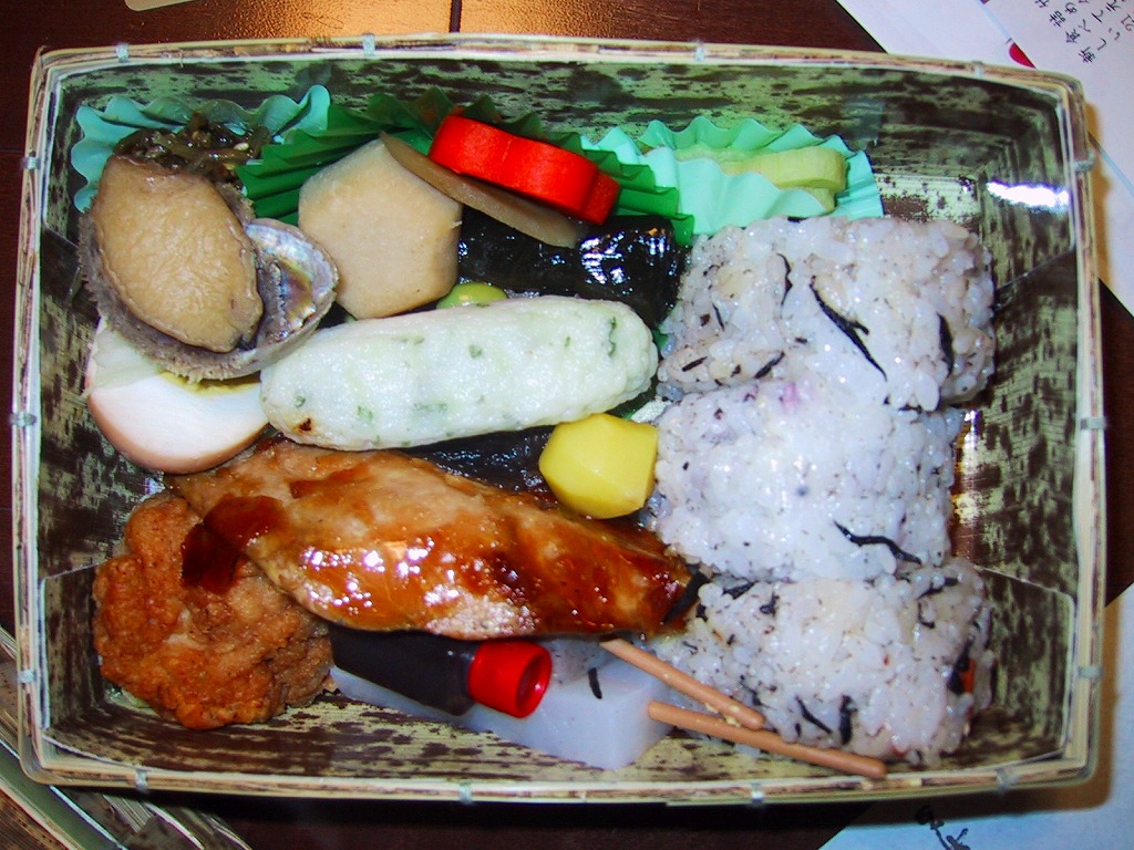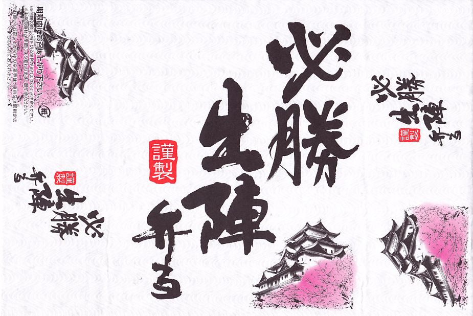 上記の駅弁「必勝出陣弁当」の、2003年時点での姿で、発売当時の姿。掛紙は駅弁の名前を墨字で描き、謹製の判とコンテストの名前を記すだけのシンプルな絵柄だった。中身は握り飯が3個にブリ照焼、とこぶし、味噌田楽、鶏唐揚、栗甘露煮など。お手拭きと楊枝も同封した幅広な箸袋に、光沢紙使用のお品書きも入る。「トコブシ」「栗」「昆布巻き」は出陣にちなんだという。