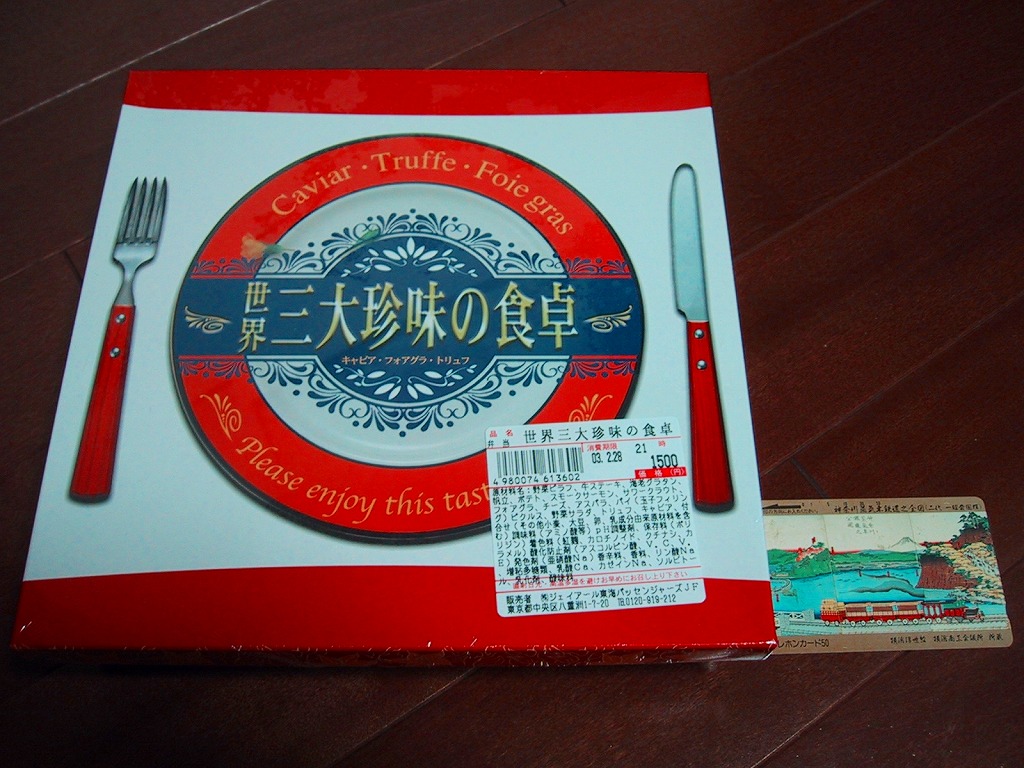 2003(平成15)年1月9日に発売した、東京駅と新横浜駅の東海道新幹線駅の改札内で販売されるお弁当。洋食卓をイメージした皿とナイフ・フォークのイラストを描くボール紙の箱を使用、中身は駅弁の名前どおり「スモークサーモンのクリームチーズキャビア添え」「黒トリュフの海鮮マカロニグラタン」「帆立貝とフォアグラのポワレ」と世界三大珍味のすべてが入り、他はピラフや牛ロースステーキやジャーマンポテトなどという洋風駅弁。メインの三大珍味はさすがに少量であるものの風味や食感を感じられるサイズは確保されており、これを除いても高級を名乗れる品質の高い駅弁。登場時には新聞やテレビで話題になった。2003年4月現在で一日200個を販売する。2004年までの販売か。