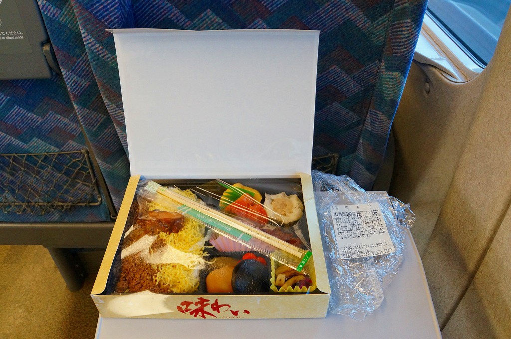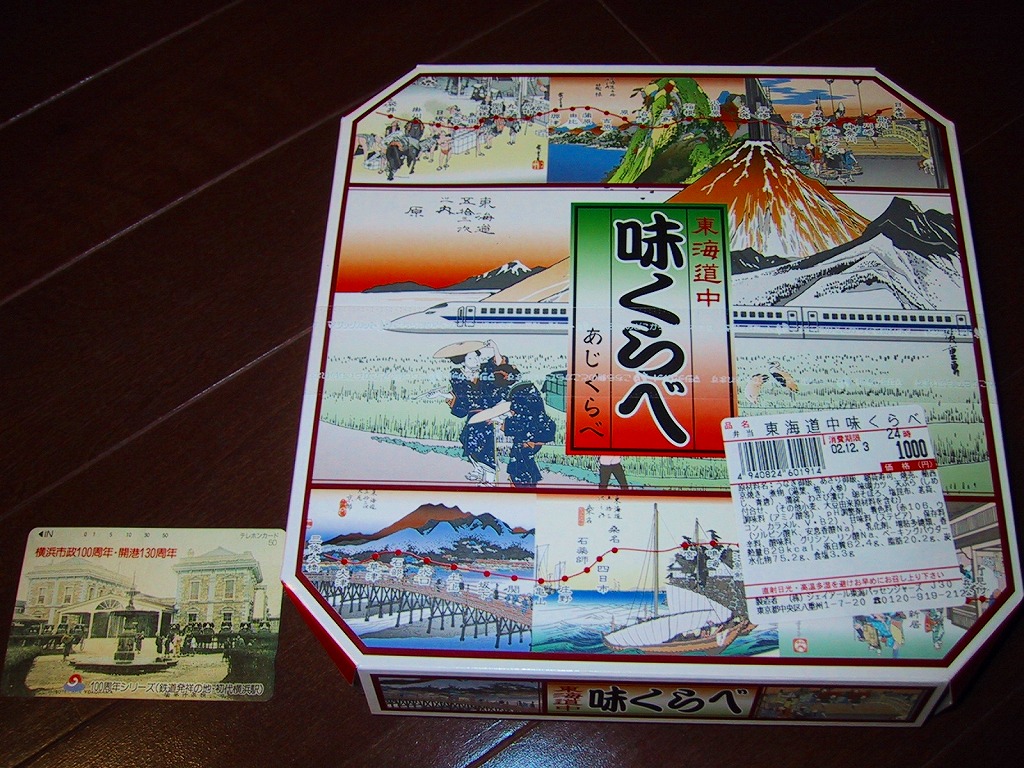 広重の東海道五十三次の絵をちりばめたパッケージ。中身はその裏面に記され、東京のあさりご飯、横浜のポーク焼売、小田原の鈴廣かまぼこ、三島のわさび漬け、静岡の鮪の西京焼き、浜松の鰻御飯、豊橋の稲荷寿司、名古屋の味噌カツ、岐阜羽島のしめじと青唐の天ぷら、京都の京風煮物、大阪の塩昆布という具合に、東海道新幹線沿線の名物11種類が9区画のトレーに収まっている、東海道新幹線車内販売限定のお弁当。購入すると鉄観音茶がもらえる。だいぶ前に売り止めた模様。