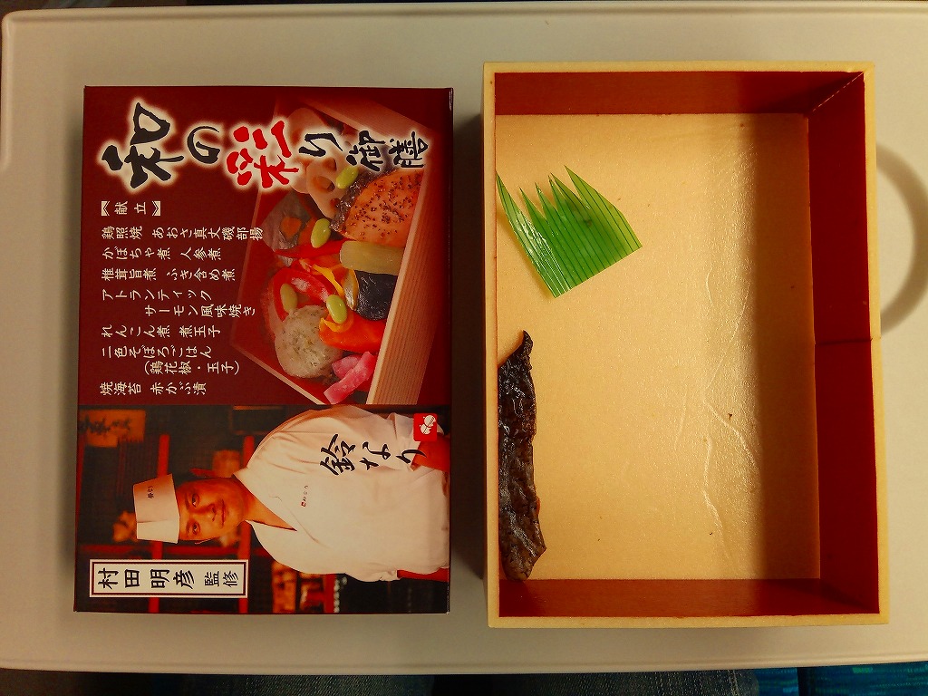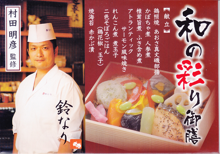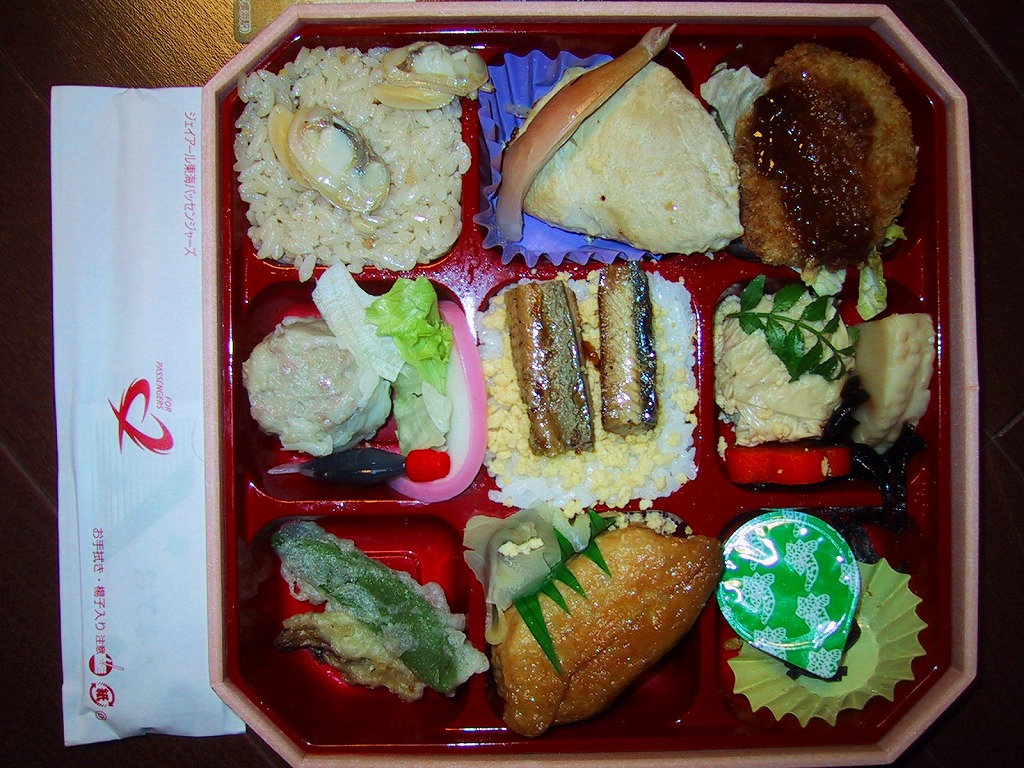 2003(平成15)年1月9日に発売した、東京駅と新横浜駅の東海道新幹線駅の改札内で販売されるお弁当。割烹・料亭のお弁当をイメージしたそうで、手触りまで漆塗り木箱を模した容器を使用、中身は煮物として大根柚子味噌や湯葉など、焼八寸として鰆西京焼や穴子棒寿司など、合肴としてカニ甲羅焼やナスなどの揚げ物、御食事として赤米混じり扇形御飯が入る。お品書きは漢字の羅列で、リストと中身を照らし合わせる作業も楽しいお弁当は、京都へ行く新幹線のグリーン車が似合いそう。あまり長くは売られなかった模様
