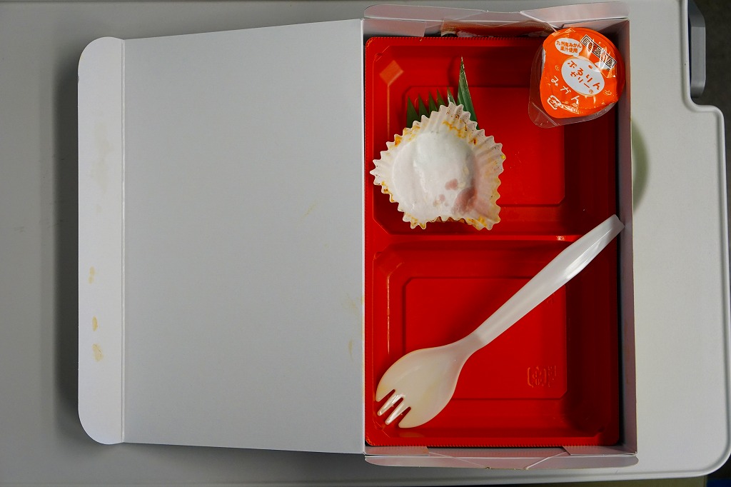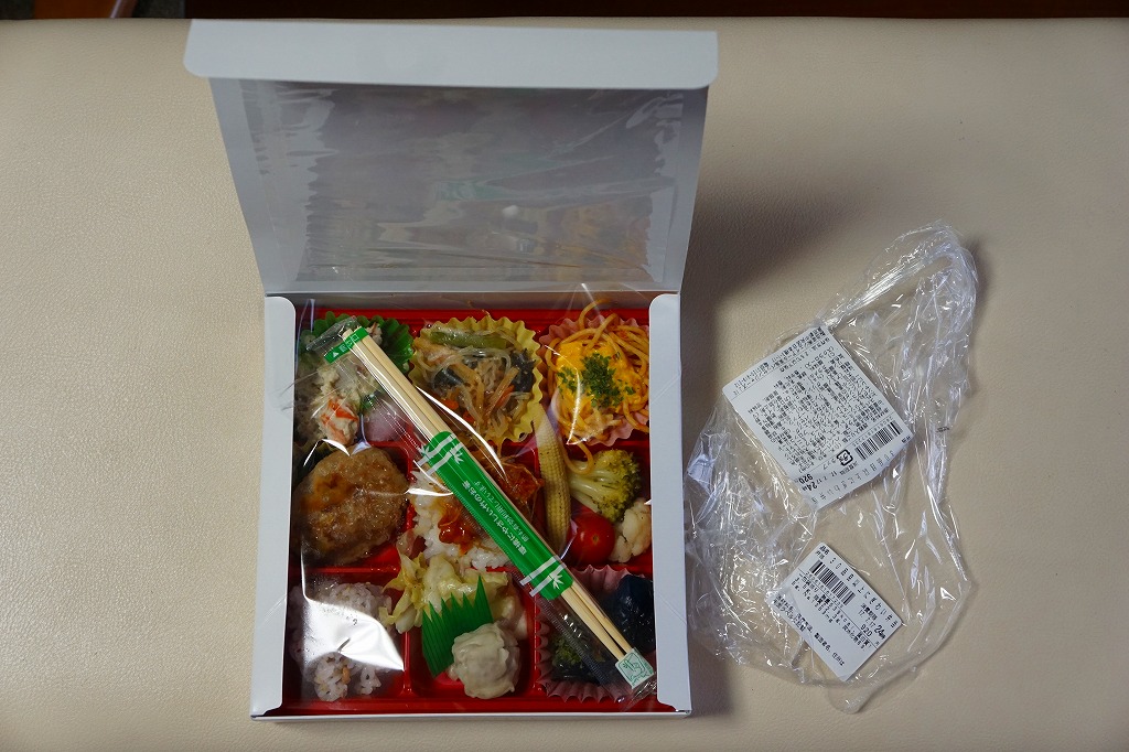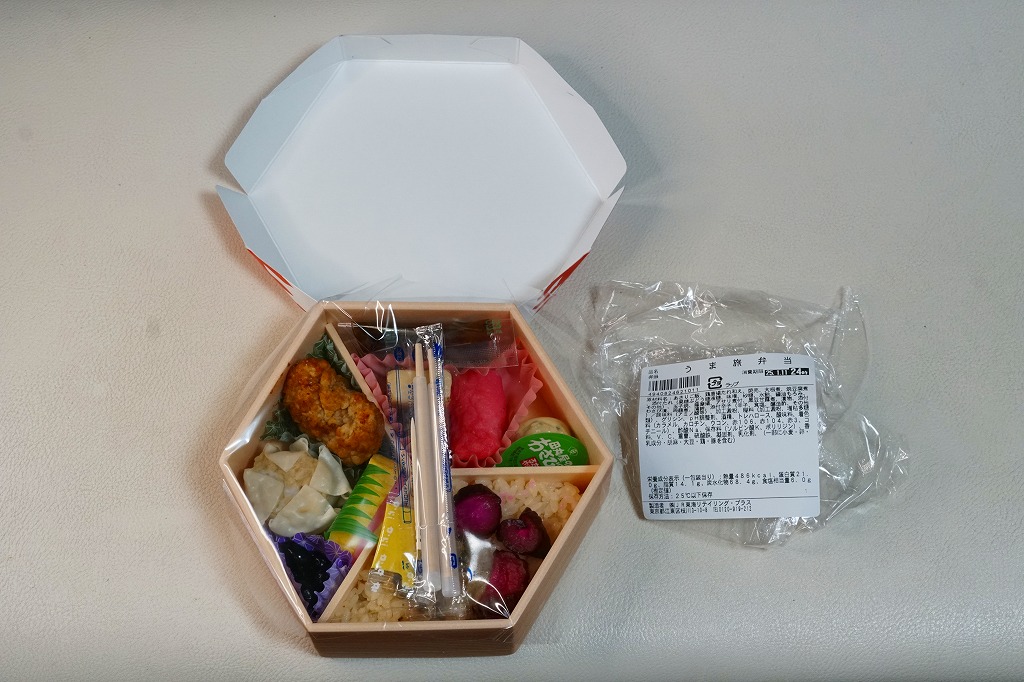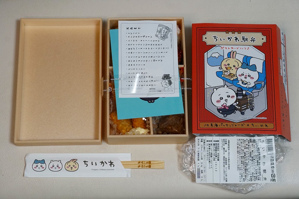発泡材のプラ容器を収めたスリーブには、東海道新幹線の列車内で弁当を食べる、アイスを食べる、車内販売員で3体のキャラクターが描かれた。中身は塩飯、いくら、ふりかけ2種、しいたけ、えびで6個のてまりずしに、鶏唐揚、エビフライ、焼鮭とかまぼこと玉子焼、焼きそばとたこ型ウインナー、ひとくちステーキ、あんこだんご、たくあん。割りばしにもちいかわの名前と顔が描かれ、3種のポストカードのうちひとつとおしながきを添付。キャラクターの駅弁なので高価だし、中身などどうてもよいものだが、渋く落ち着いた内容と食べやすい盛り付けで、弁当として見ても悪くない。