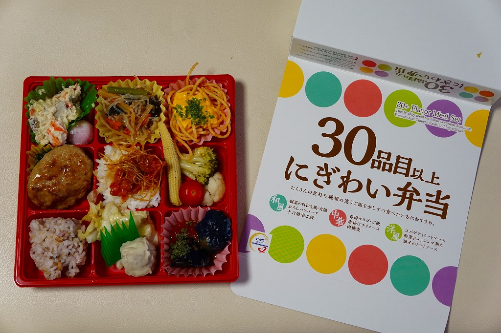 2015(平成27)年の夏頃の発売か。その名とコンセプトはきっと、同じ東京駅で売られる日本レストランエンタプライズ(NRE)の「30品目バランス弁当」を意識したのではないかと思う。中身はパッケージに書かれるとおり、9区画のトレーの3区画が「和風」で「根菜の白和え風・大福」「おろしハンバーグ」「十六穀米ご飯」、3区画が「中華」で「春雨サラダ・ご飯」「唐揚げチリソース」「肉焼売」、3区画が「洋風」で「スパゲティミートソース」「野菜ドレッシング和え」「茄子のトマトソース」。ごちゃごちゃと賑やかに、いろんなものを詰めている。不思議と、飯と麺状の物と擦り物が目立つ気がした。価格は2017年の購入時で920円、2019年にいったん終売し、2020年に940円で復活。2022年までの販売か。