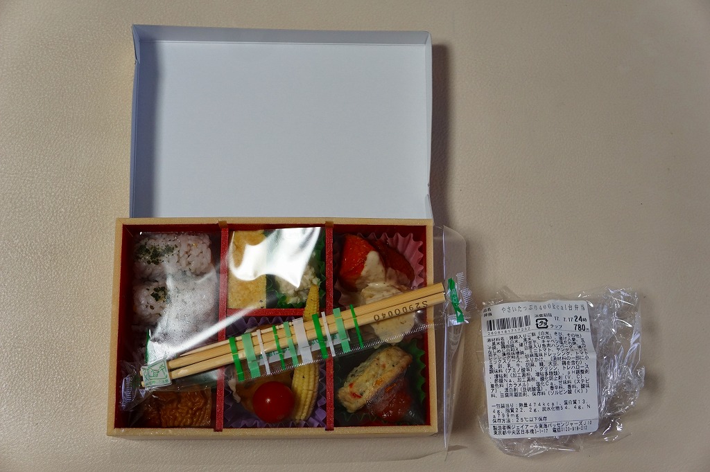 野菜の使用に加えてパッケージに中身の食材を描く点で「やさいたっぷり弁当」を、カロリーを今回購入のもので474kcalに抑えた点で「400kcal台弁当」を受け継いだ。本物の肉や肉の味が入り、野菜ばかり食べさせるような感じがなく、薄味や低カロリーで物足りなくなることなく、味と食感は弱くなかった。調製元の宣伝文どおり、カロリー控えめながら、満足の出来るお弁当。2020年までの販売か。
