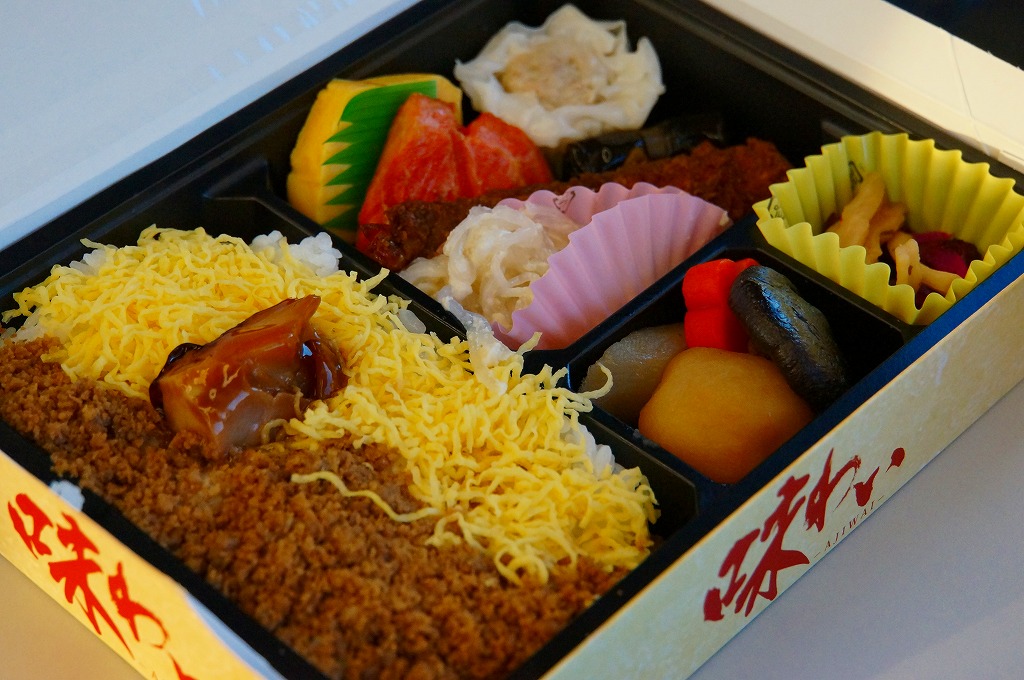 これは廉価版の幕の内駅弁なのだろうか、駅弁としては大きめな、JRCPでは標準サイズの専用紙箱に入った黒いトレーの中に、とりそぼろと錦糸卵と鶏照焼を載せた白御飯、エビフライ、玉子焼、鮭塩焼、しゅうまい、シイタケやゴボウなどの煮物、シラタキ白和え、漬物などを詰める。同社の千円以上の駅弁とあまり変わらない分量と内容だと思う。現存しない模様。
