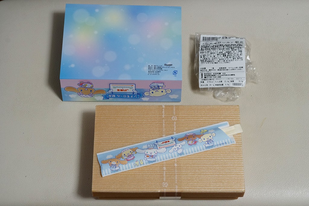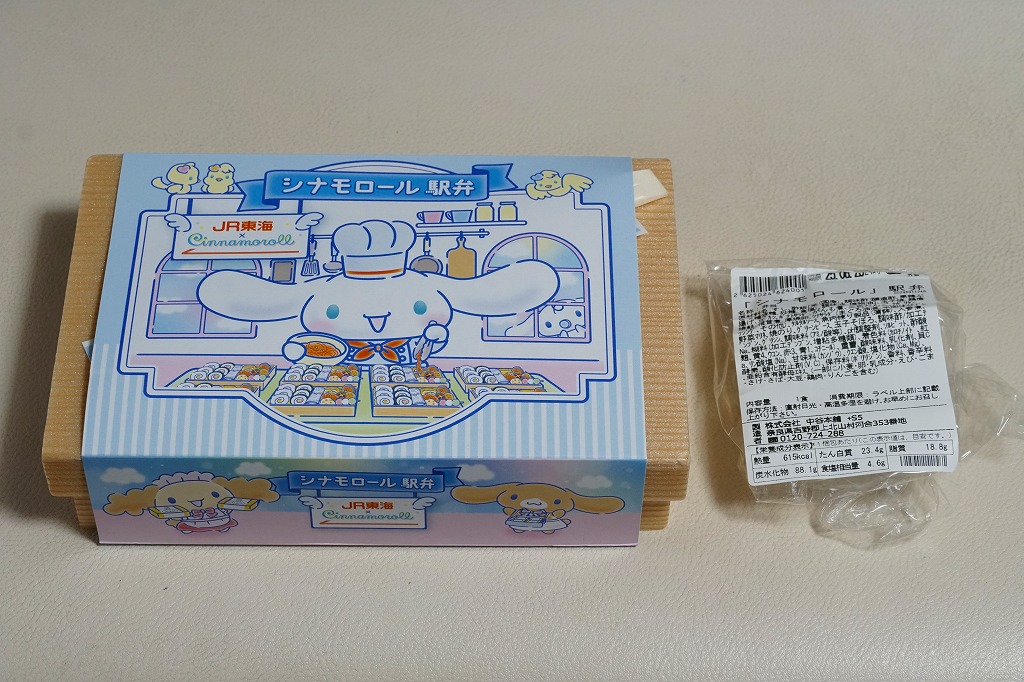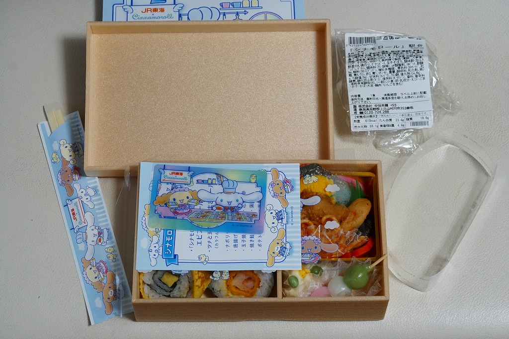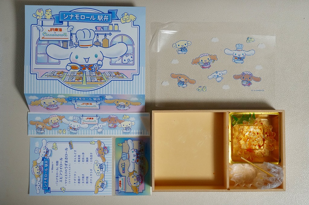コンセプトは「特製エビフライやシナモンのかわいい尻尾をイメージしたうずまきロールなど、シナモロールの世界観をイメージしたコラボ駅弁!」。掛紙の絵柄はもちろん、サンリオのキャラクターで2002年に発売された「シナモロール」であり、実物と中身が少し異なる弁当を調製している。箸袋、おしながき、添付のカードやシートもシナモロール。中身はエビフライロール、ツナと玉子のうずまきロール、ナポリタン、唐揚げ、玉子焼き、焼き鮭、ポテトサラダ、がんもどき、椎茸煮、花形人参、蒲鉾、三色団子。ちょっと不思議で、幼くも若くもないと思う内容もまた、きっとシナモロールの世界観。