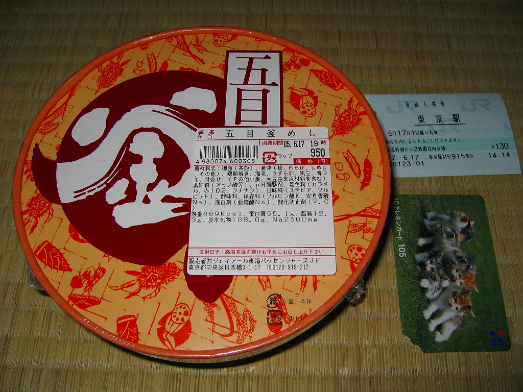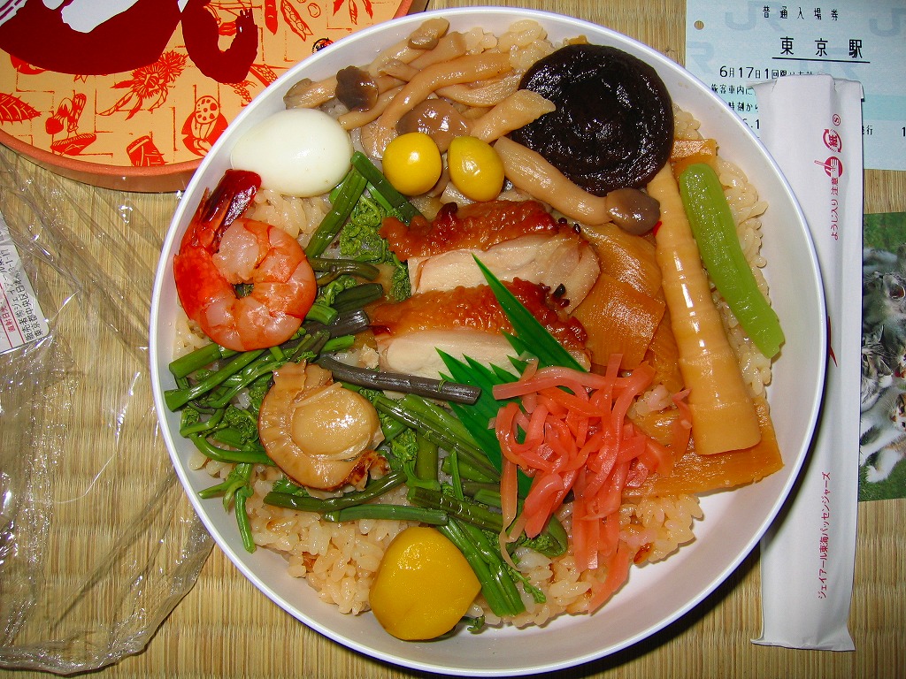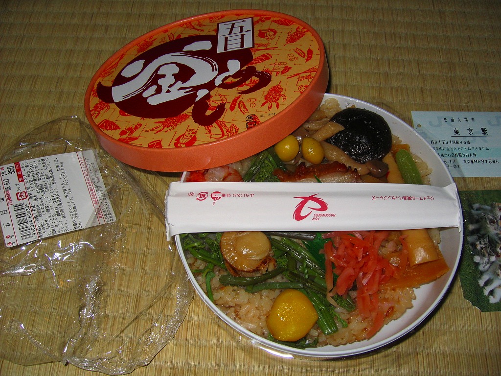 数年毎にまるで過去と決別するように商品一新をかけるJRCPの駅弁の中で、非常に珍しく1990年代から、過去少なくとも10年は同じ容器と内容で売っているもの。ボール紙の円筒形の容器の中身は、茶飯の上に鶏肉やワラビやシメジや椎茸や海老や栗やうずらの卵などを敷き詰めた五目飯。釜飯の雰囲気はないものの、他の釜飯駅弁と比較して分量と具の種類で勝る。いつまで売られたかは不明。