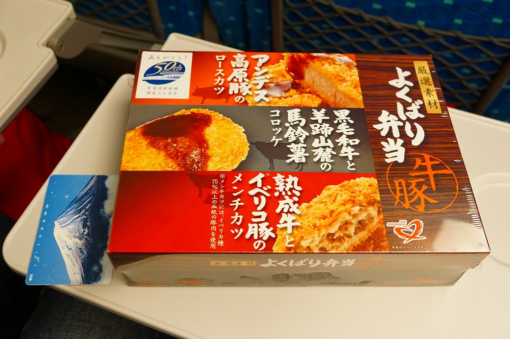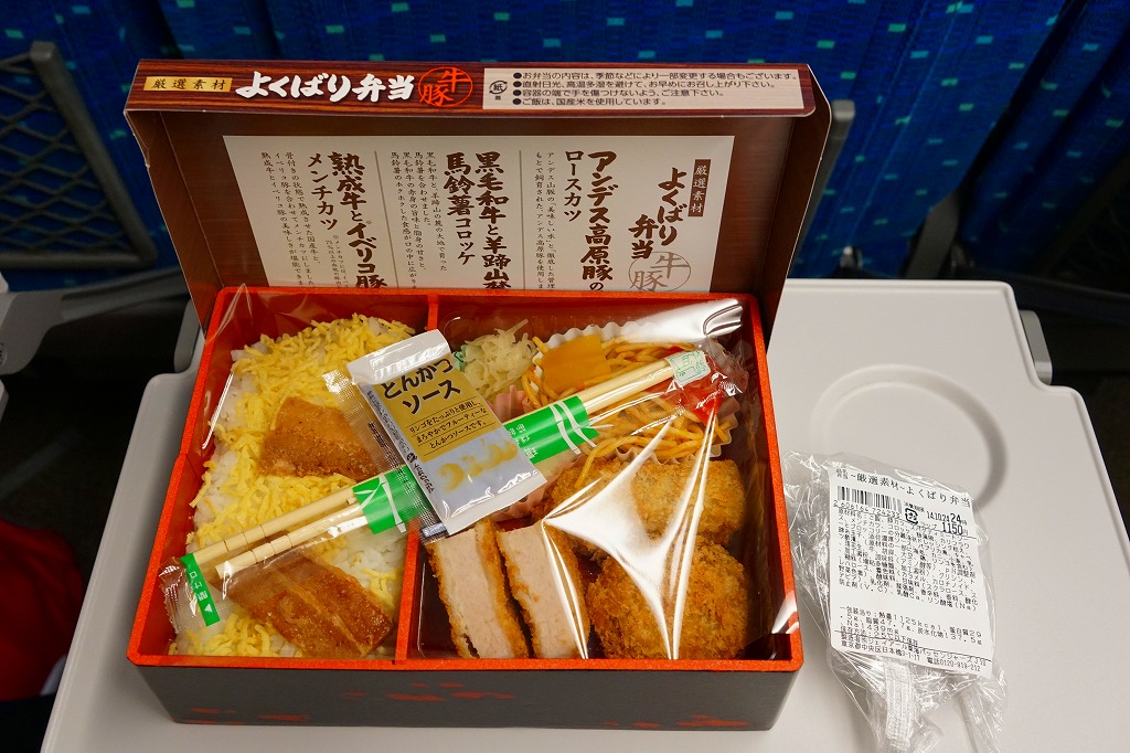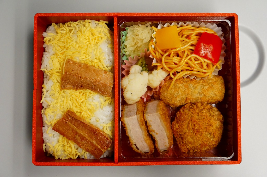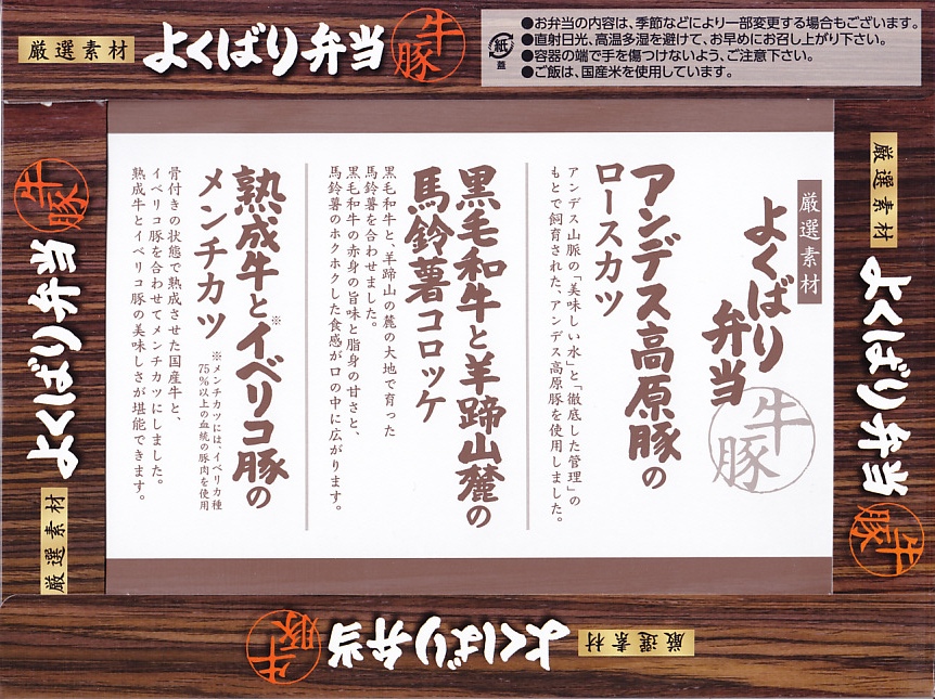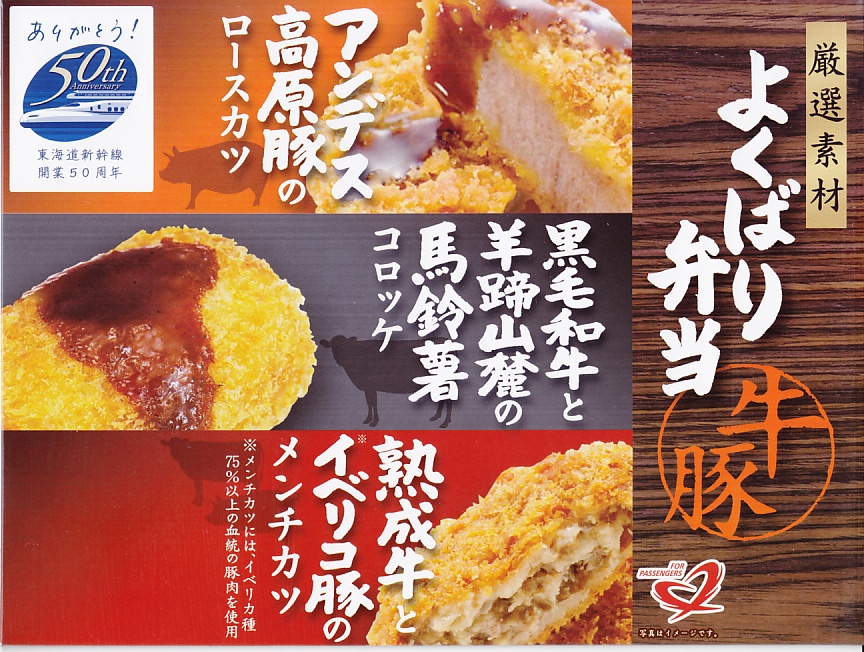 2014(平成26)年の春までに東京・品川・新横浜・名古屋・京都・新大阪の各駅で発売か。白飯には錦糸卵と豚蒲焼2枚を載せ、おかずはロースカツ2切れ、メンチカツ1個、コロッケ1個、スパゲティ、カリフラワーとブロッコリー、パプリカ2枚、キャベツ酢漬け。パッケージの表面と裏面にあるとおり、ロースカツにはアンデス高原豚、メンチカツには熟成牛とイベリコ豚、コロッケには黒毛和牛と羊蹄山麓馬鈴薯が使われるという。朝飯にして失敗した、揚げ物だらけのがっつり駅弁。2016年までの販売か。