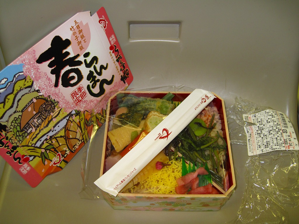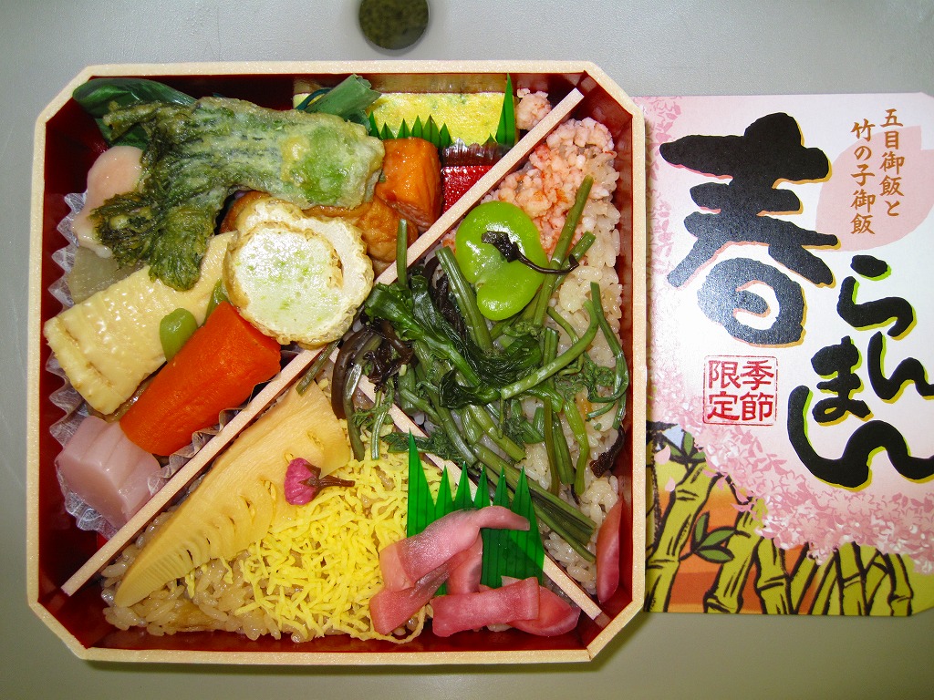 2009(平成21)年春の季節弁当で、おそらく東京・品川・新横浜・名古屋・京都・新大阪の各駅と東海道新幹線車内で販売。弁当名のとおり、正方形の容器を対角線で仕切った中身の1/4が山菜の載る五目御飯、1/4がタケノコや桜花の載る竹の子御飯、残りがおかずで鮭塩焼、笹巻麩、薩摩揚、肉団子、サトイモやニンジンなどの煮物、タラの芽の天ぷらなど。