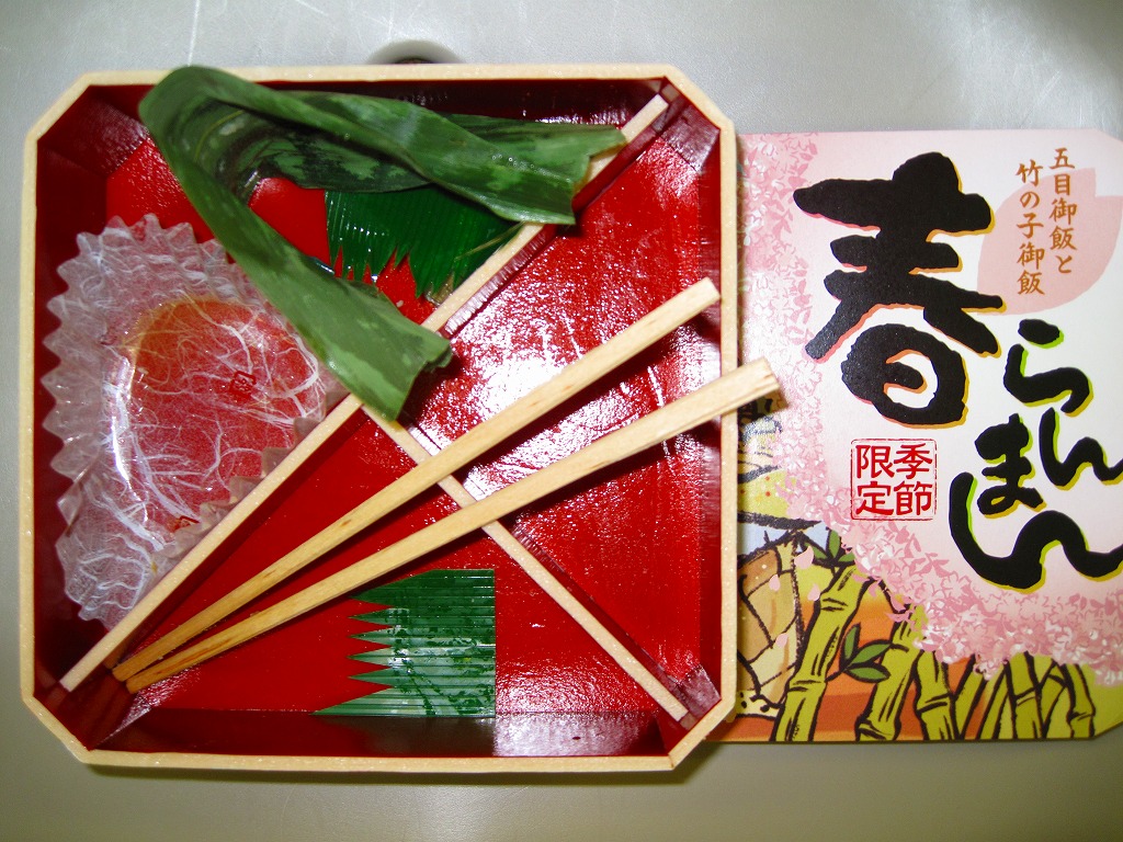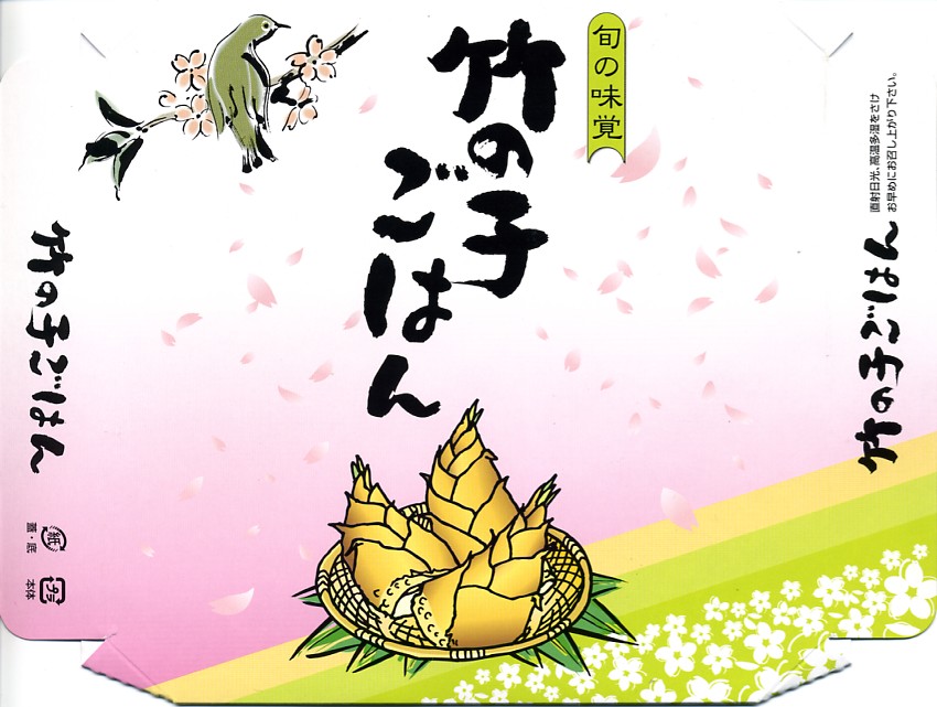 東海道新幹線の東京・品川・新横浜の各駅で販売された、2006年春の季節駅弁。ほぼ正方形の容器に、タケノコとウグイスなどを描いたボール紙のふたをして、ラップで包み食品表示ラベルを貼る。中身はタケノコと大根桜漬けと錦糸卵とゼンマイとグリーンピースが載るタケノコ御飯に、玉子焼、マス西京焼、イイダコ、白い薩摩揚、串こんにゃく、里芋など。