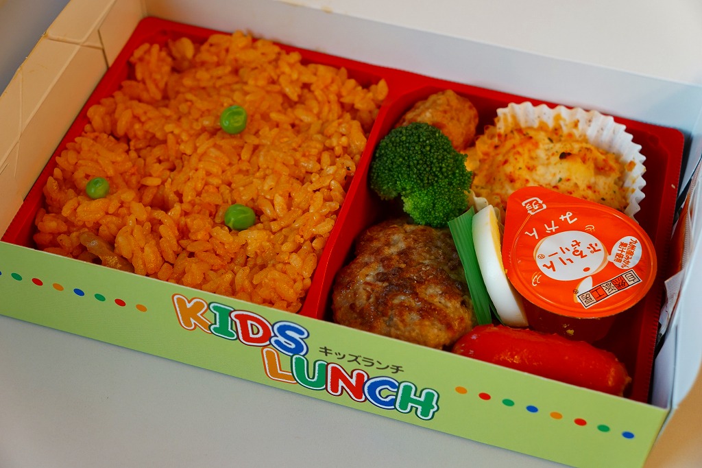 子供向け商品のデザインを持つボール紙箱に入れた赤いプラ製トレーの半分がマッシュルーム入りチキンライス、半分がマカロニグラタン、ハンバーグ、鶏つくね揚、ポテトフライ、ウインナー、ブロッコリー、ゆで卵、みかんゼリー。中身の具材とパッケージの絵柄が合うのはJRCPの十八番。子供向け駅弁、お子様ランチ駅弁にありがちな冷凍食品感がなく、食感も風味もまともで、価格もたった620円と安く、これはなかなかの実力派。