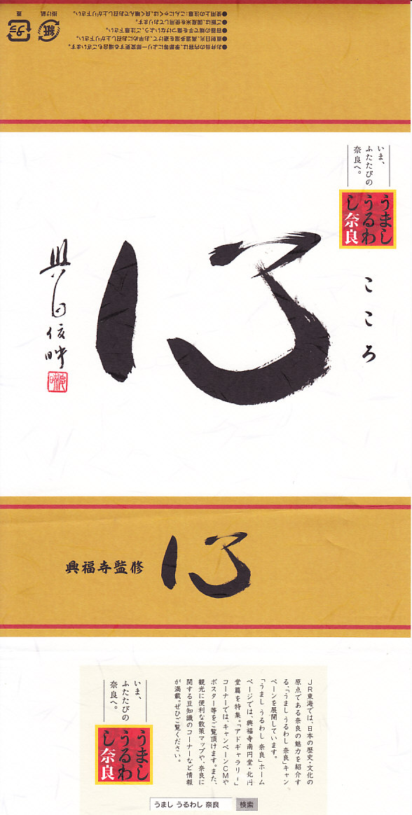 2013(平成25)年4月3日から6月上旬まで、東海道新幹線のぞみ号停車駅、つまり東京・品川・新横浜・名古屋・京都・新大阪の各駅で販売された期間限定駅弁。奈良県の興福寺が監修したといい、掛紙にはその貫首である多川氏の直筆による「心」の題字が描かれる。