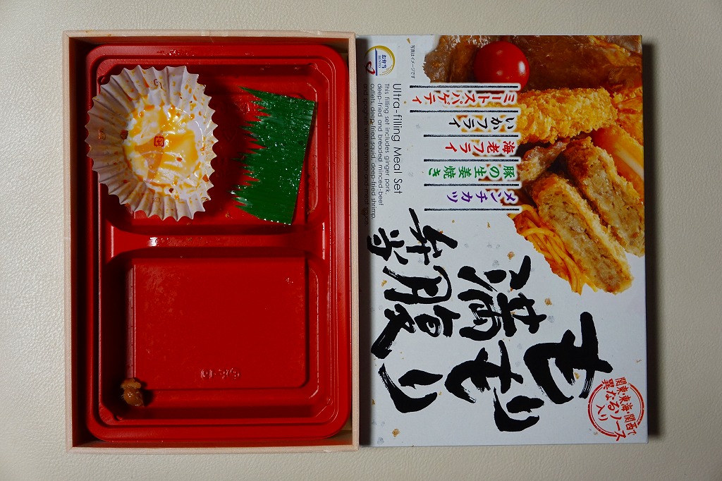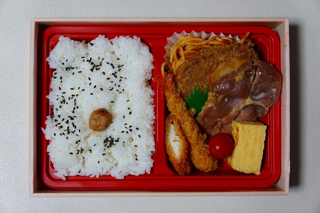 2017(平成29)年6月21日の発売。日の丸ごはんに、メンチカツ、豚の生姜焼き、海老フライ、いかフライ、ミートスパゲティという、ふたに記されたおかずたちと、玉子焼とミニトマトを添える。肉と油と脂と炭水化物で、容赦ない構成。1年弱ほどの販売か。