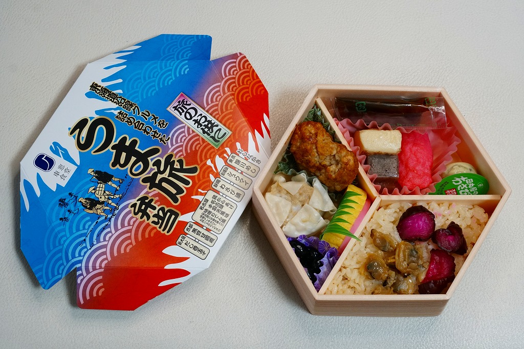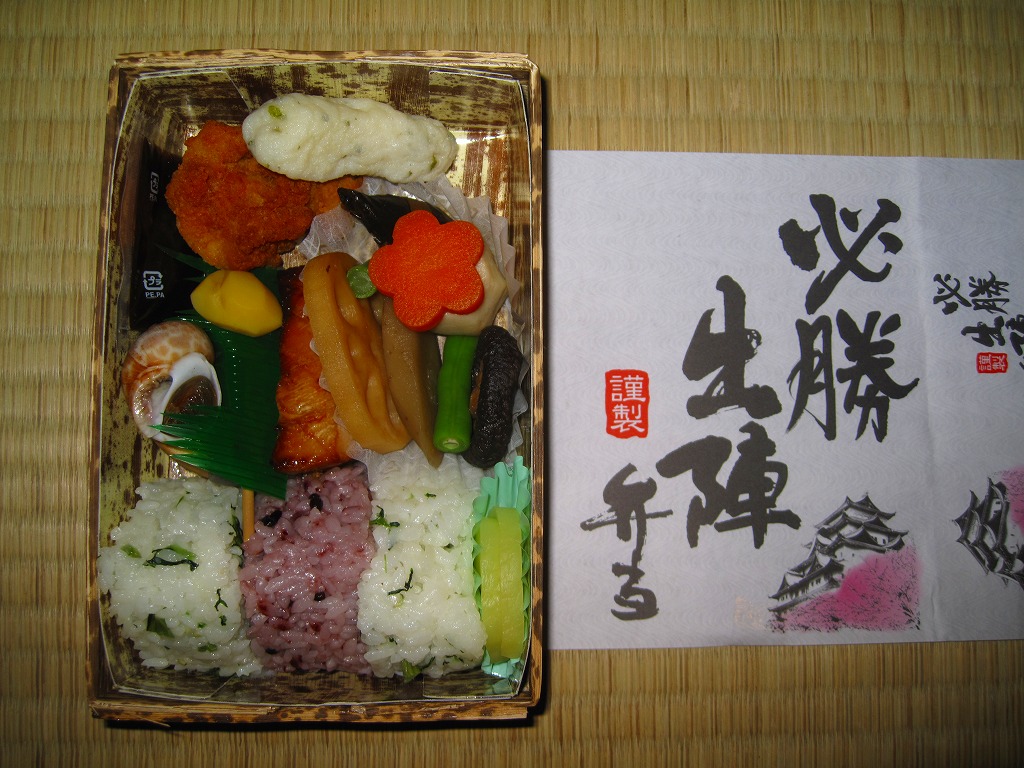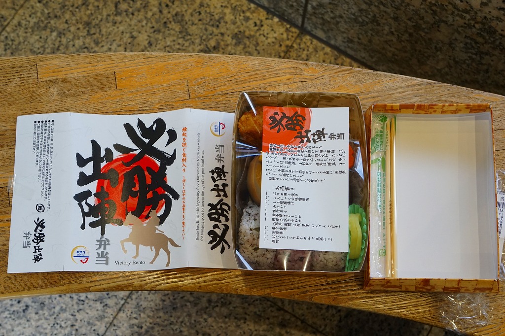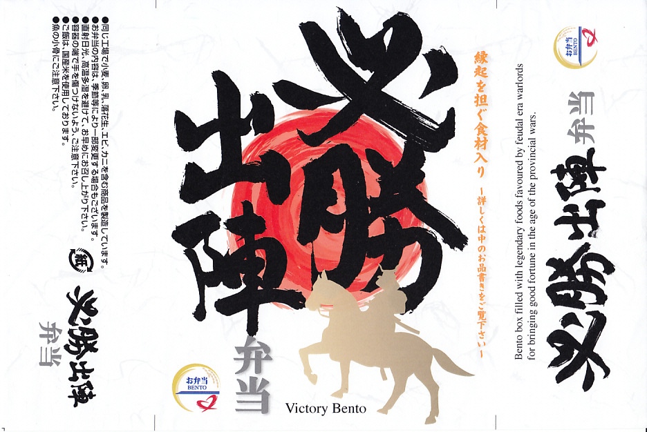 竹皮編み柄のボール紙製容器に、駅弁の名前や日の丸などを力強く描いた掛紙をかける。中身はしそわかめ2個と黒米1個のおにぎりに、ブリ照焼、味噌田楽、薩摩揚、みそかつ、味付玉子、黄金焼きのしいか、野菜の炊き合わせ、栗甘露煮、昆布巻、漬物。必勝や出陣ということで、縁起を担ぐ食材を取り入れたそうな。2011(平成23)年1月に「必勝出陣弁当」へ改称。価格は2017年の購入時で1,050円。2018(平成30)年限りで終売か。2021(令和3)年8月2日に980円で再発売、価格は2022年時点で1,000円。2022年までの販売か。