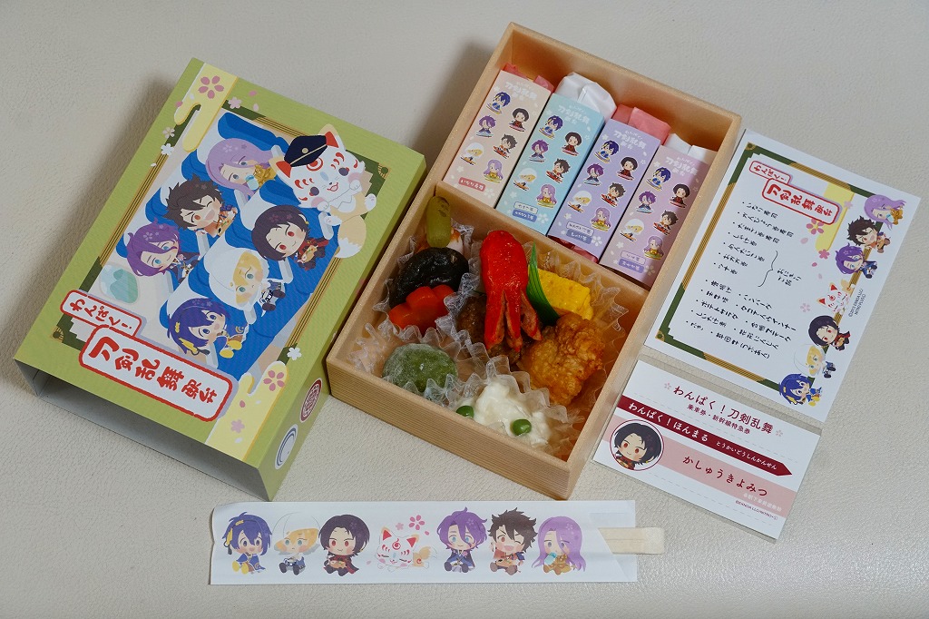 刀剣乱舞の駅弁は、水戸駅で2017年と2018年と2019年に出ている。今回はこのオンラインゲームに登場する「刀剣男士」なる美男子たちを、サンリオが2頭身のキャラクターに作り替えて、2020年1月からイラストやグッズを展開する「わんぱく!刀剣乱舞」とした。東京駅でJR東海の子会社が管理する地下商店街「東京駅一番街」でも期間限定の物販が年2回のペースで出ていて、この駅弁コラボにつながったのだろうか。