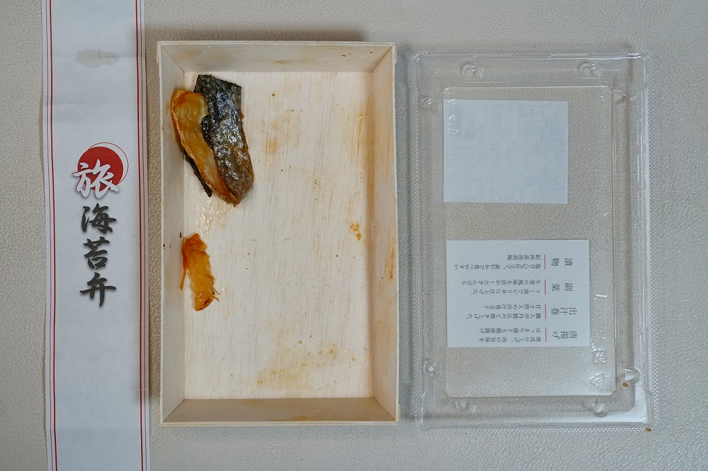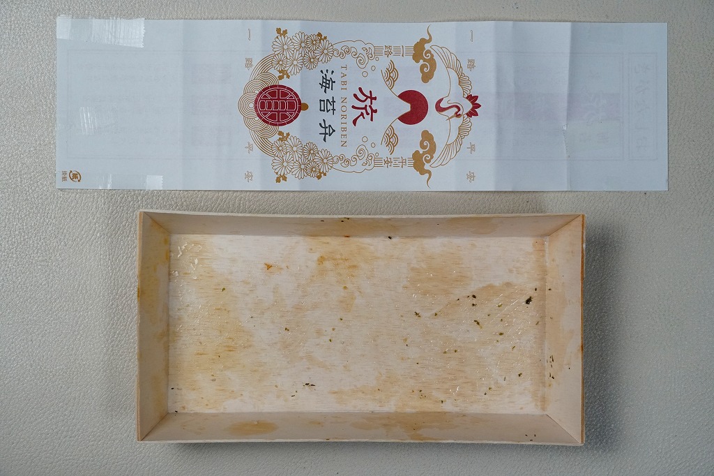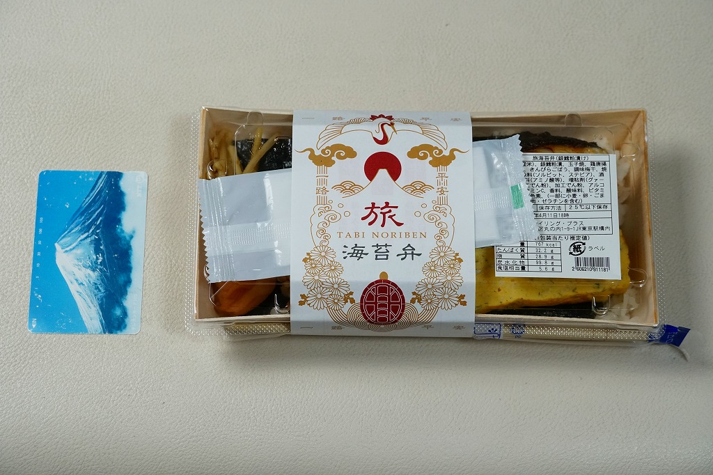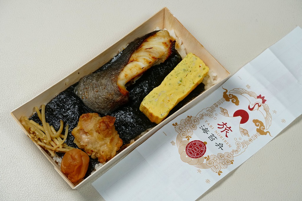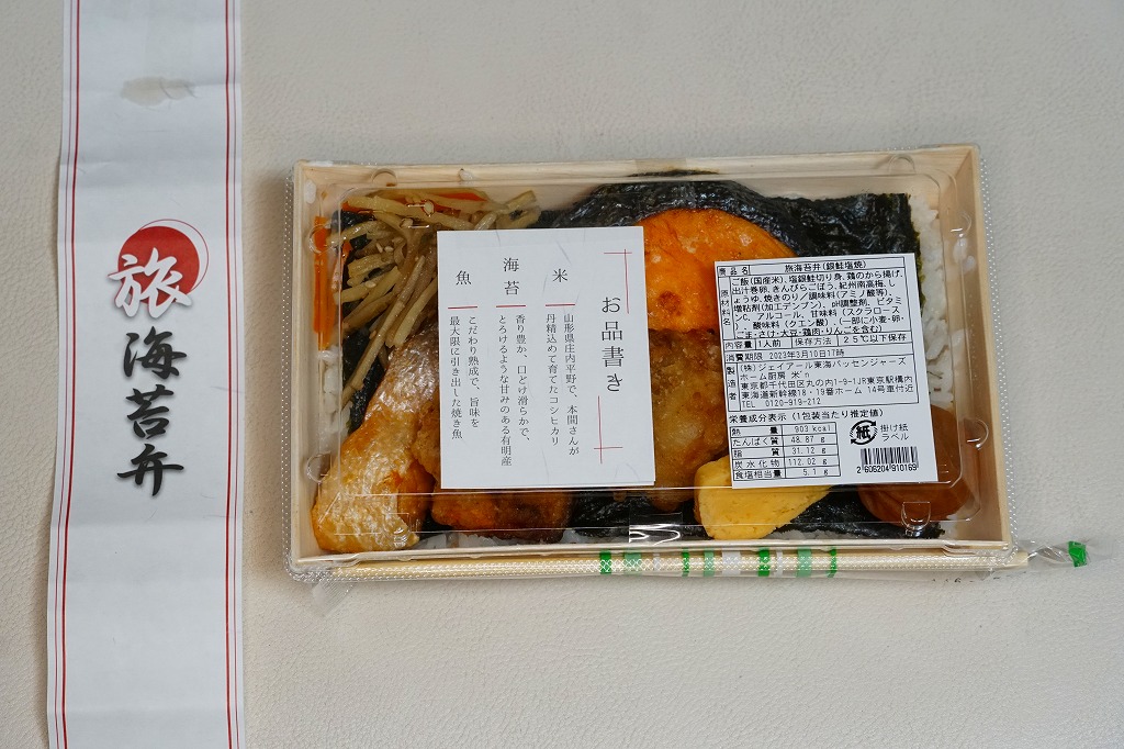 2025年4月に東海道新幹線の18・19番ホーム上で買えた旅海苔弁。訪問時は10種類のおにぎりの他に、同じ容器と紙帯を共有する弁当「銀鮭塩焼き」(1,280円)「銀鱈粕漬け」(1,300円)が新商品として売られていた。これは「銀鱈粕漬け」のほうで、食品表示ラベルにそう書いてある。木質エコ容器に白飯を詰め、海苔を貼り、銀だら粕漬け、玉子焼、鶏唐揚げ、きんぴらごぼう、梅干しを載せる。2023年の開店時に売られた「旅海苔弁」の現況なのだろう、ほどよい分量の高級海苔弁。