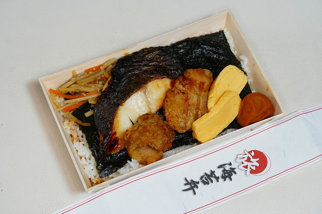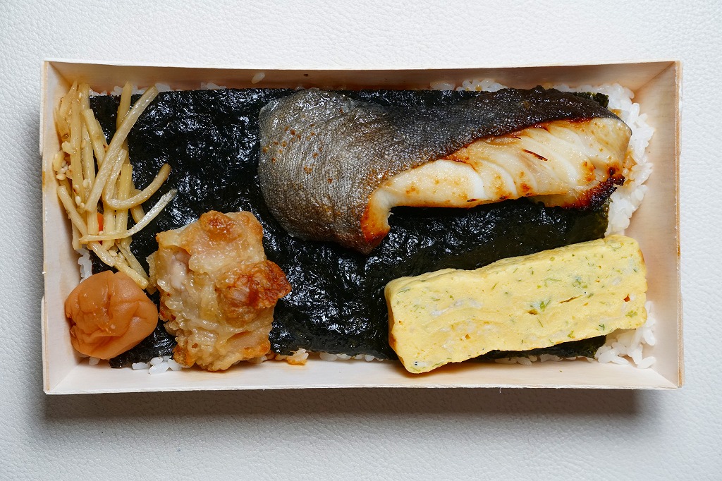 これは「銀鱈西京焼」。長方形の平たい木質エコ容器に、庄内米コシヒカリの白飯を敷き、有明海産の焼き海苔を貼り、銀鱈西京焼き、鶏のから揚げ、出汁巻卵、ラー油でピリ辛のきんぴらごぼう、紀州南高梅を盛り付ける。近年の東京でいくつか出てきている、本格志向の高級海苔弁当。簡単なお品書きを付け、商品名を書いた紙帯を締め、店内で調製し暖かい状態で売られる。世の鶏卵不足により2023年4月10日から6月20日まで、出汁巻玉子を抜いて30円引きで販売。2025年時点でこの姿では現存しない模様。