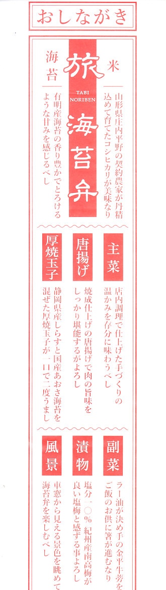 2023(令和5)年1月26日に東海道新幹線東京駅のホーム上で発売。18・19番ホームの14号車付近で2022年9月限りで閉店した、1987年に開店した東京駅史上初の立ち食いそば店「グル麺」の跡地にできた、できたて海苔弁とおむすび専門店「ホーム厨房 米’n(こめいん)」で、海苔弁当「旅海苔弁」2種類と、おむすびやお惣菜を売り始めた。