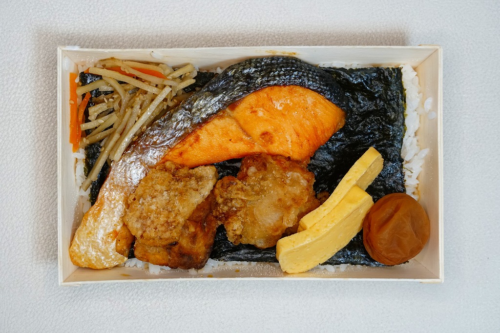 これは「銀鮭塩焼」。長方形の平たい木質エコ容器に、庄内米コシヒカリの白飯を敷き、有明海産の焼き海苔を貼り、塩銀鮭切り身、鶏のから揚げ、出汁巻卵、ラー油でピリ辛のきんぴらごぼう、紀州南高梅を盛り付ける。近年の東京でいくつか出てきている、本格志向の高級海苔弁当。簡単なお品書きを付け、商品名を書いた紙帯を締め、店内で調製し暖かい状態で売られる。世の鶏卵不足により2023年4月10日から6月20日まで、出汁巻玉子を抜いて30円引きで販売。2025年時点でこの姿では現存しない模様。