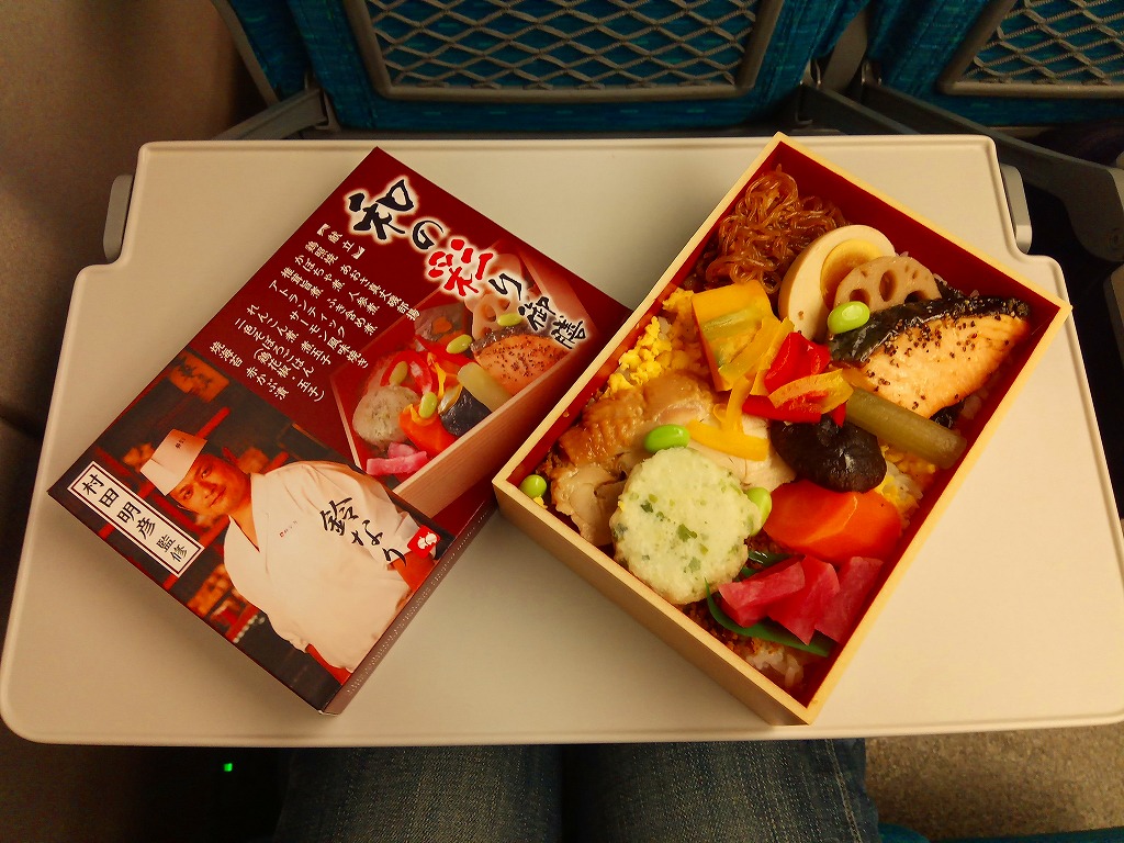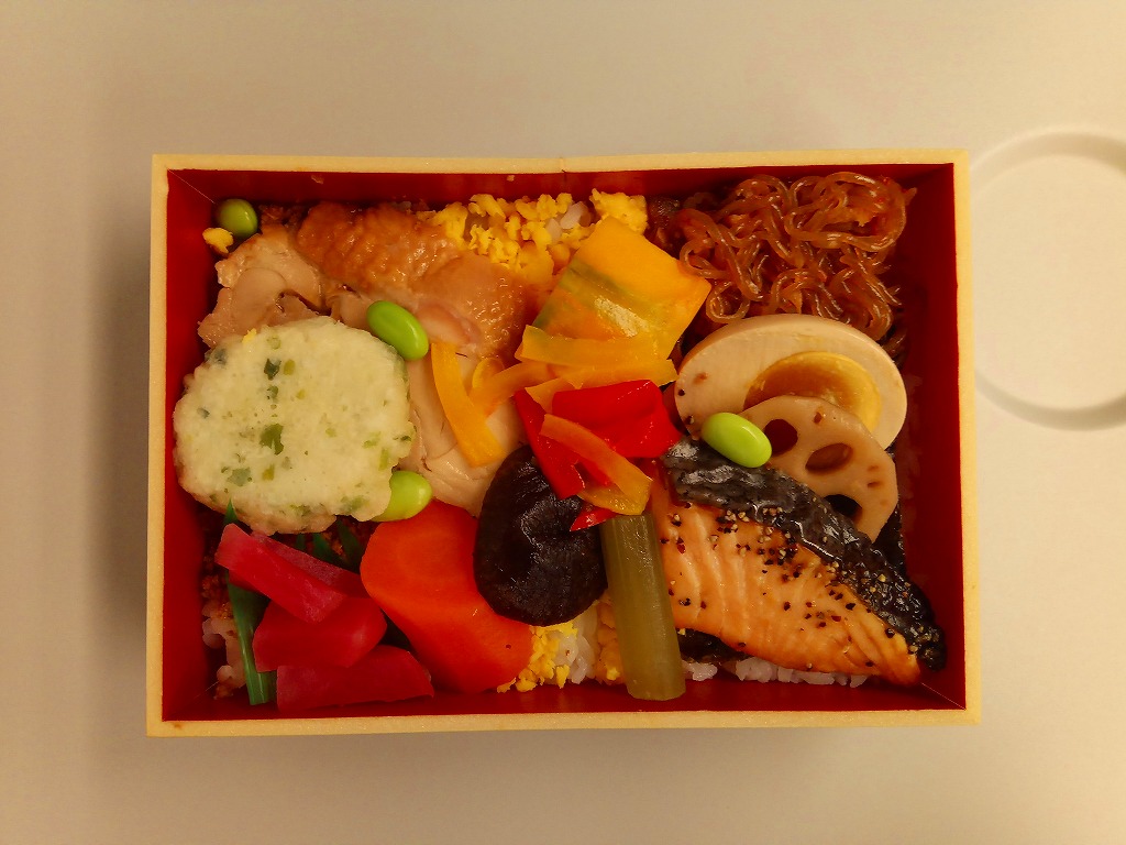 2019(令和元)年12月12日に東京、品川、新横浜の各駅で発売。後に名古屋、京都、新大阪の各駅でも販売したのだろうか、今回は名古屋駅で購入。東京都新宿の日本料理店「鈴なり」店主の村田明彦による監修といい、その半身と中身の写真をふたに使う。中身は、容器に敷き詰めた白飯を、鶏そぼろと玉子そぼろで覆い、鶏照焼、サーモン焼、カボチャやニンジンなどの煮物、煮玉子、糸こんにゃく、パプリカ、漬物を散らしてさらに覆うもの。この種の商品は、いにしえの東京駅「ニッポンの駅弁」以来、おなかいっぱい。1年間ほどの販売か。