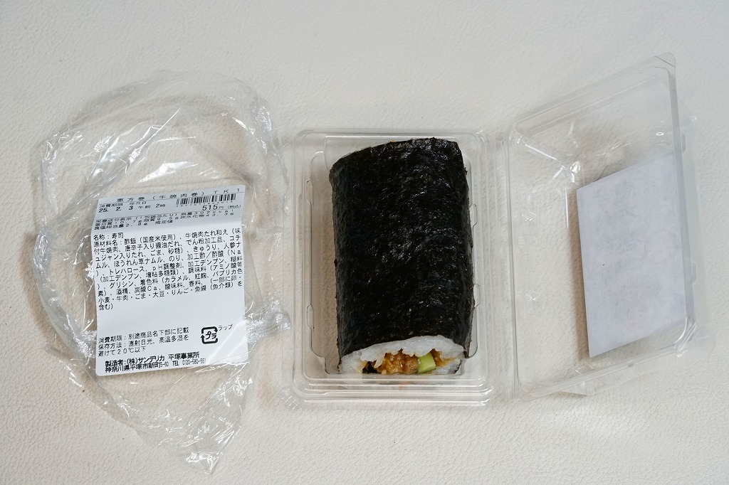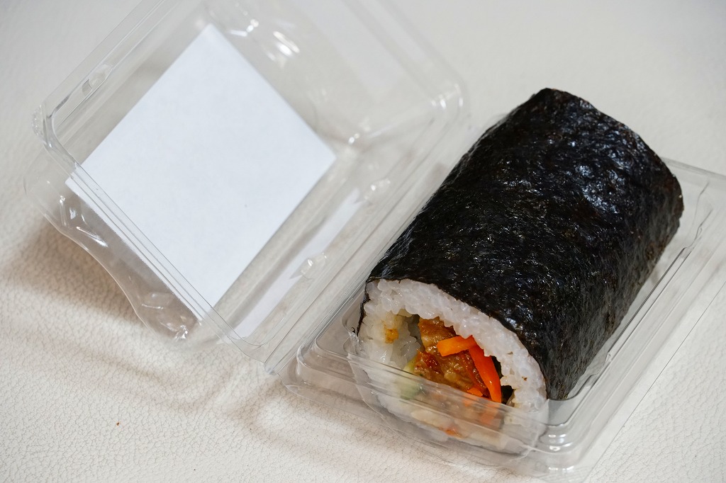 2025(令和7)年の節分の日に買えた恵方巻。東海道新幹線の駅弁売店では例年、もっと大きく高価な恵方巻が売られたと思うが、この年に買えたのはこれだけだった。透明なプラ容器に、コンビニおにぎり程度の分量である小さな太巻きを1個入れ、ラップを巻いて商品名と食品表示のラベルを貼る。牛焼肉、きゅうり、にんじんナムル、ほうれん草ナムルを酢飯と海苔で巻いた、韓国風焼肉海苔巻。駅弁にはとても見えない、スーパーの惣菜。