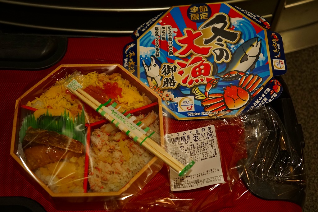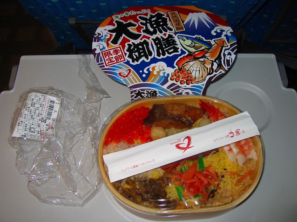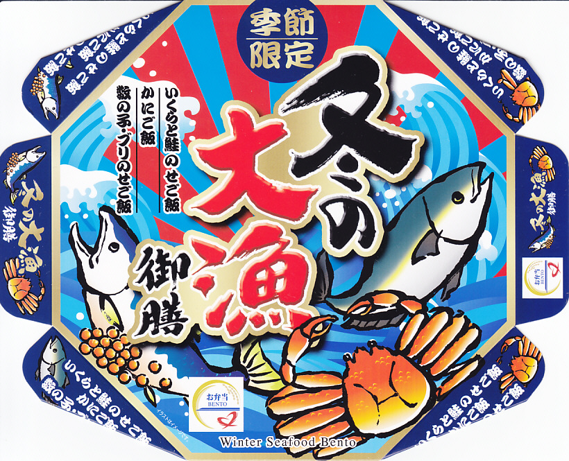 どちらかといえば夕食向け。見た目こそ具の節約で余ったすき間を紅生姜や錦糸卵で隠しているようだが、中身はしっかり詰まり、飯に対する具の分量は適切で、味もまあ良い。パッケージの食材のイラストと中身の一致は、JRCPのお家芸であるような。2010年度版から「冬の大漁御膳」と名を変え、同じ名前と違う中身で、以後も毎冬に出た模様。2016年までの販売か。