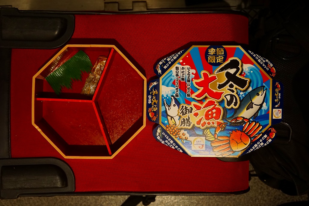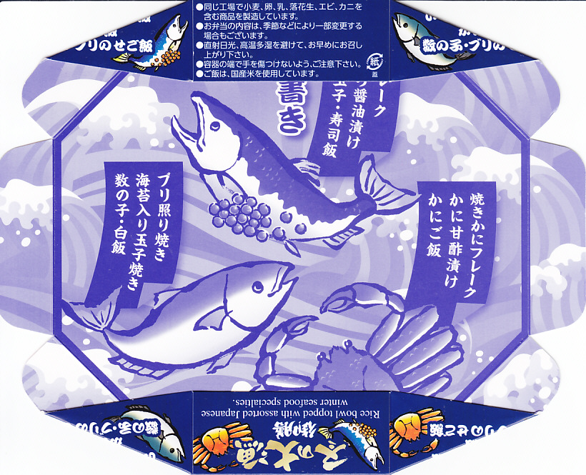 東海道新幹線の主な駅で売られる冬の季節駅弁で、今回は2015(平成27)年12月3日からおそらく2016(平成28)年3月5日までの販売。正八角形の容器を3つに分けて、カニ御飯、イクラとサケのせ御飯、カズノコとブリのせ御飯を詰める、御飯で固めた内容。3種の丼で賑やかに、パッケージの絵柄はもっと賑やかに、東海道新幹線の沿線とはまるで関係のない北の海の味を取り入れる。販売はこのシーズンが最後になった模様。