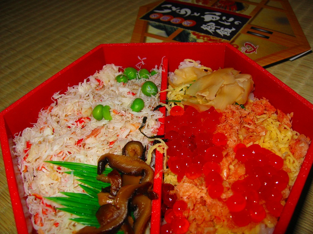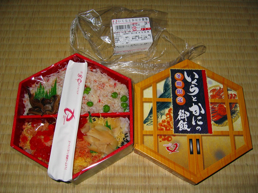 2006年12月1日から2007年2月28日まで、各駅と車内で販売された季節限定弁当。正六角形の容器に商品名を描いたボール紙のふたをはめて、ラップで包んで食品表示ラベルを貼る。中身はカニほぐし身にグリーンピースと刻み椎茸を添えた御飯と、イクラに錦糸卵と鮭フレークや錦糸卵やガリを詰めた御飯で半分ずつ。