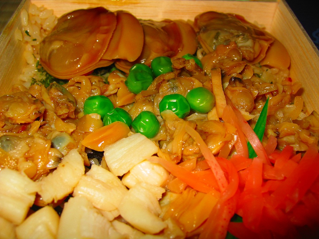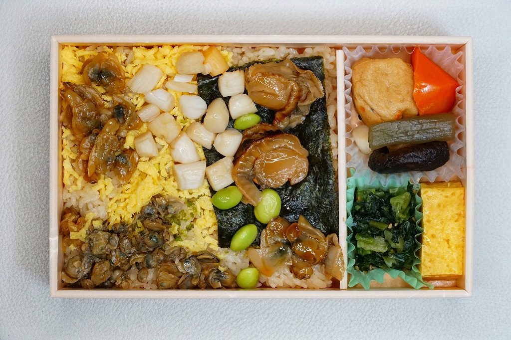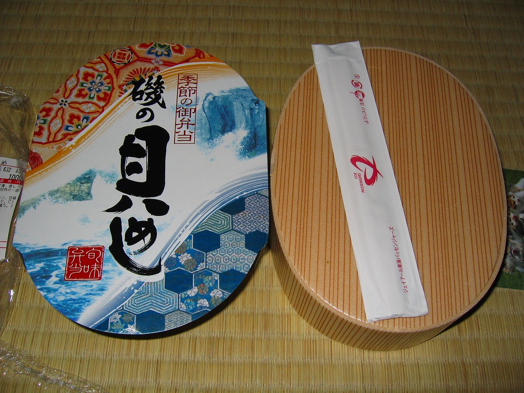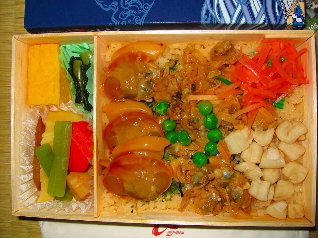 2005(平成17)年の6月1日から9月14日まで販売された、夏季限定の駅弁。ふたがきれいに枠にはまる、木目調の楕円形の容器を、割りばしを挟みボール紙の枠にはめてラップで包み食品表示ラベルを貼る。中身は貝の炊込御飯の上にアカニシ貝と貝柱をどっさりと載せ、蒸しウニと小茄子漬と生姜を添えるもの。