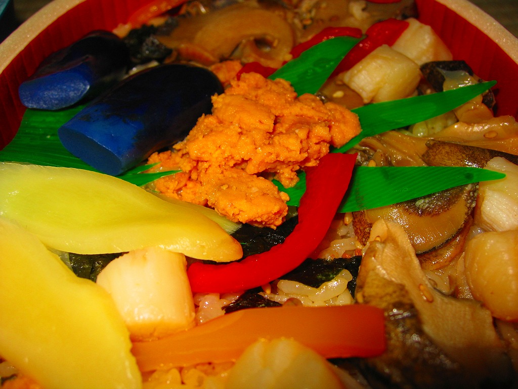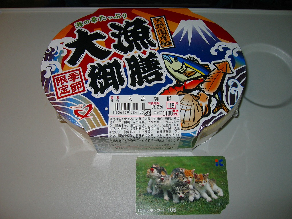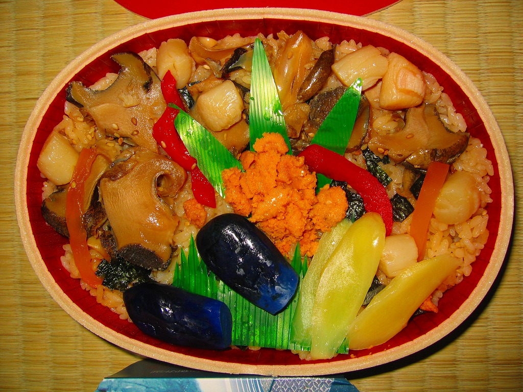 2007(平成19)年に冬季限定弁当で発売か。今回の2008年度版は、楕円形状の容器に透明なふたをして、同一形状で賑やかな絵柄のボール紙の枠にはめ、ラップに包んで食品表示ラベルを貼る。中身は炊込飯の上にブリ照焼、イカ照焼、貝柱、カニフレーク、ボイル海老、イクラ、シジミなどを載せるもの。