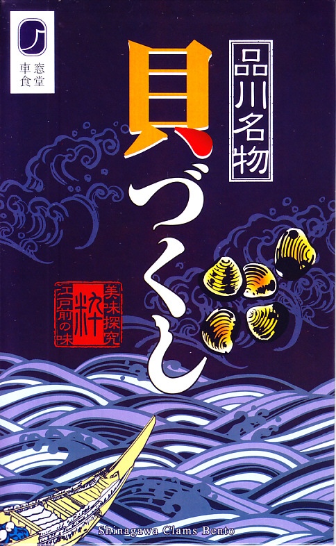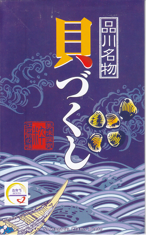 2005(平成17)年6月12日に購入した、品川駅弁の紙ふた。上記の2013年のものと比べて、調製元のロゴマークの有無しか違わない。価格は据え置き、中身もハマグリの大小くらいしか違わず、ここでは異例のロングセラーとなっている。