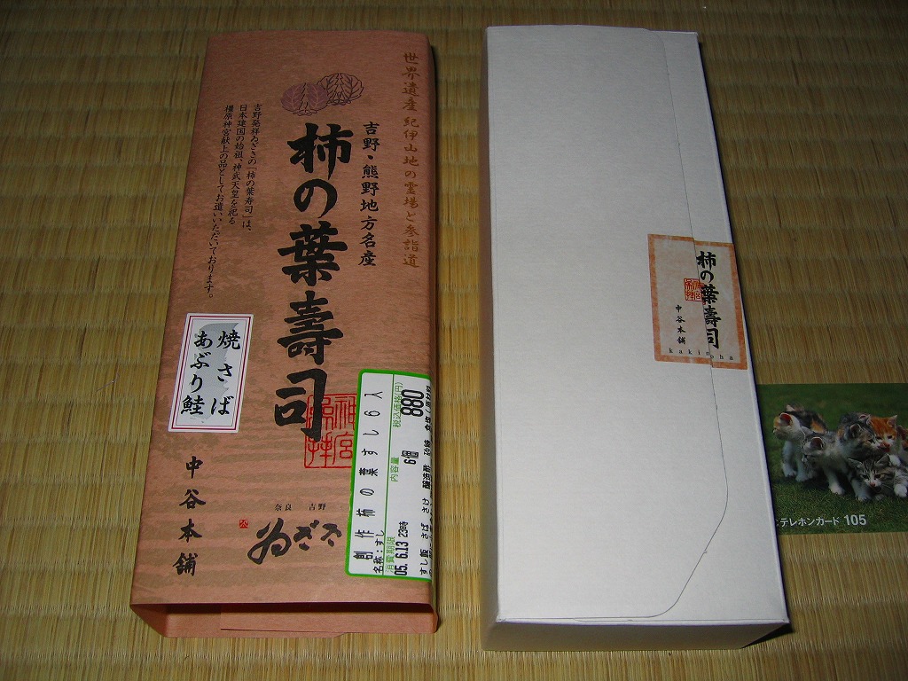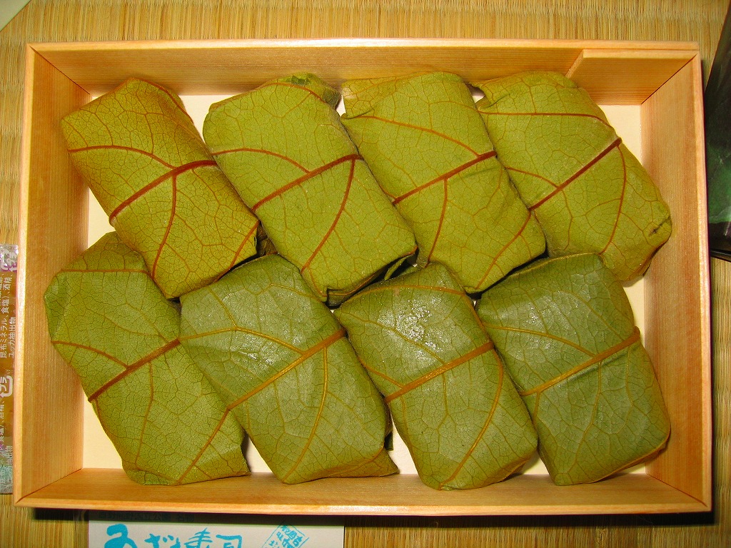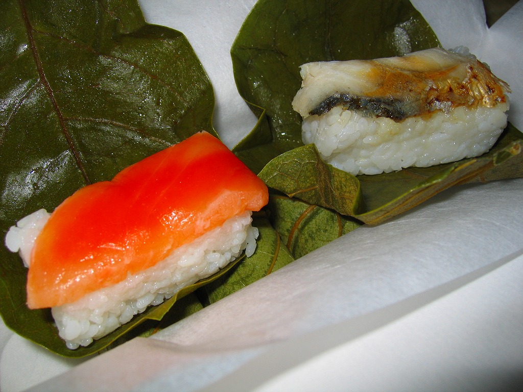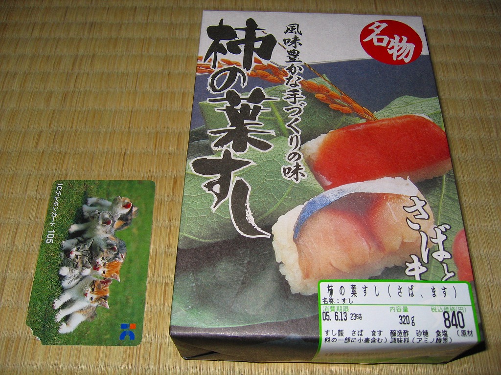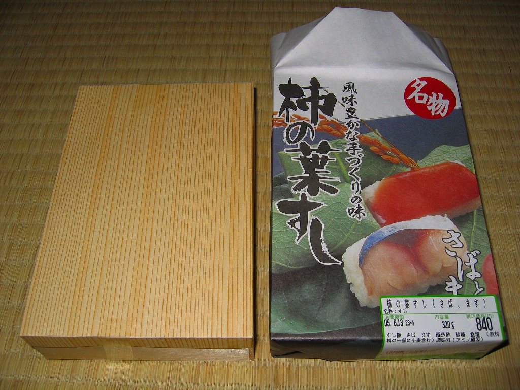 おそらく東京や新横浜など東海道新幹線の主要駅で販売されると思われる、JRCP扱いの柿の葉寿司。経木枠の長方形の容器にボール紙の木目蓋をかけて、中身の飾り付け例のカラー写真を載せた包装紙で包む。中身は商品名のとおり、サバとマスの柿の葉寿司。しかしずいぶんと塩辛かった。