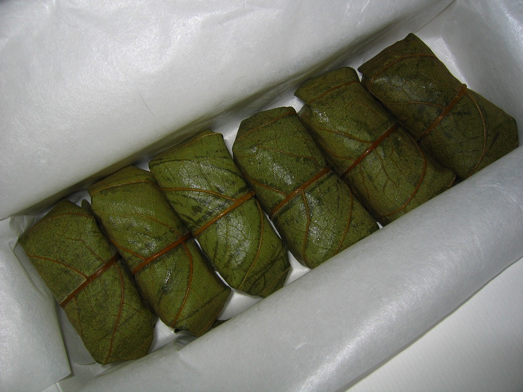 おそらく東京や新横浜など東海道新幹線の主要駅で販売されると思われる、JRCP扱いの柿の葉寿司。焼サバと鮭の柿の葉寿司を3個ずつの中身を和紙風シートで包み、白いボール紙箱を掛紙で巻く。同時に購入し食べた上の商品は塩辛かったが、こちらはそうではなく見た目のままの普通の味。