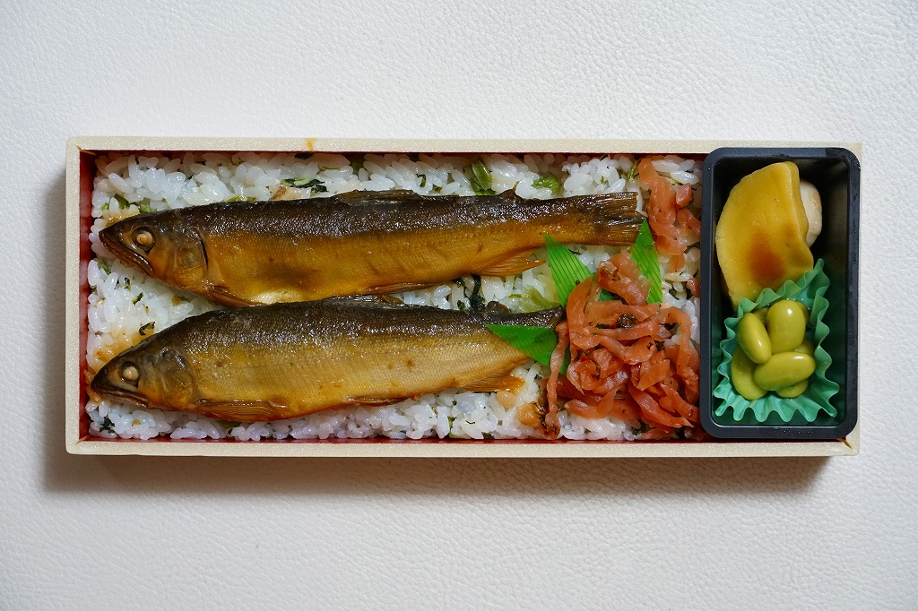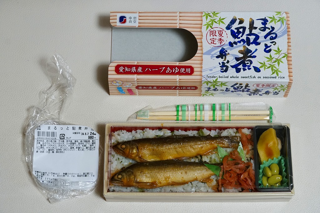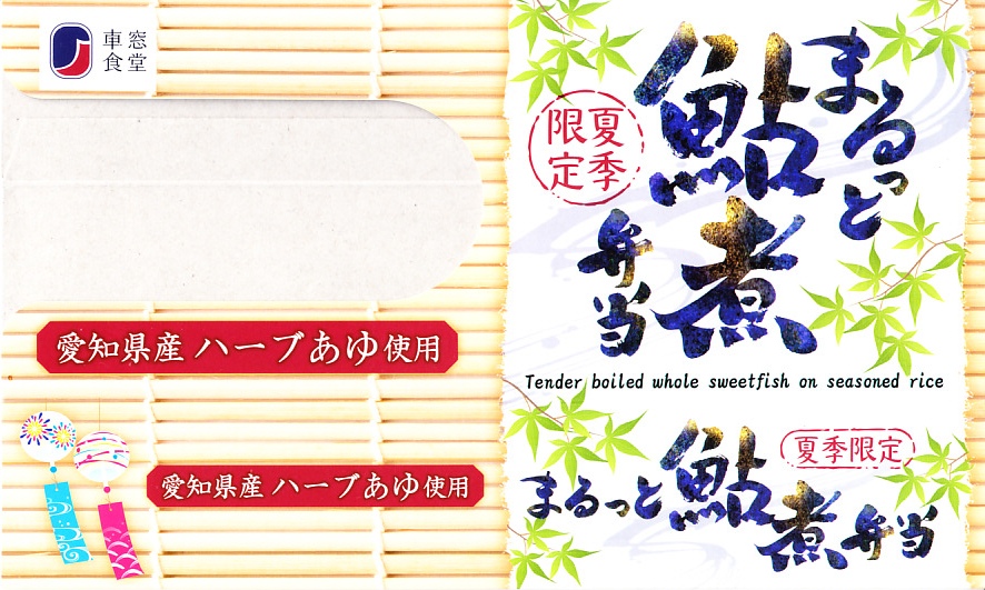 2024(令和6)年6月18日に東海道新幹線の東京、品川、新横浜、名古屋、京都、新大阪の各駅で発売された夏季限定駅弁。昭和時代や20世紀ならともかく、アユ駅弁の新作が出ることや、すしでないアユ駅弁、そもそもアユの駅弁が売られることが、とても珍しいことだと思う。しかも東京など大都会の駅で。細身の長方形のプラ容器を収めるスリーブには、まきすのような模様を描く。