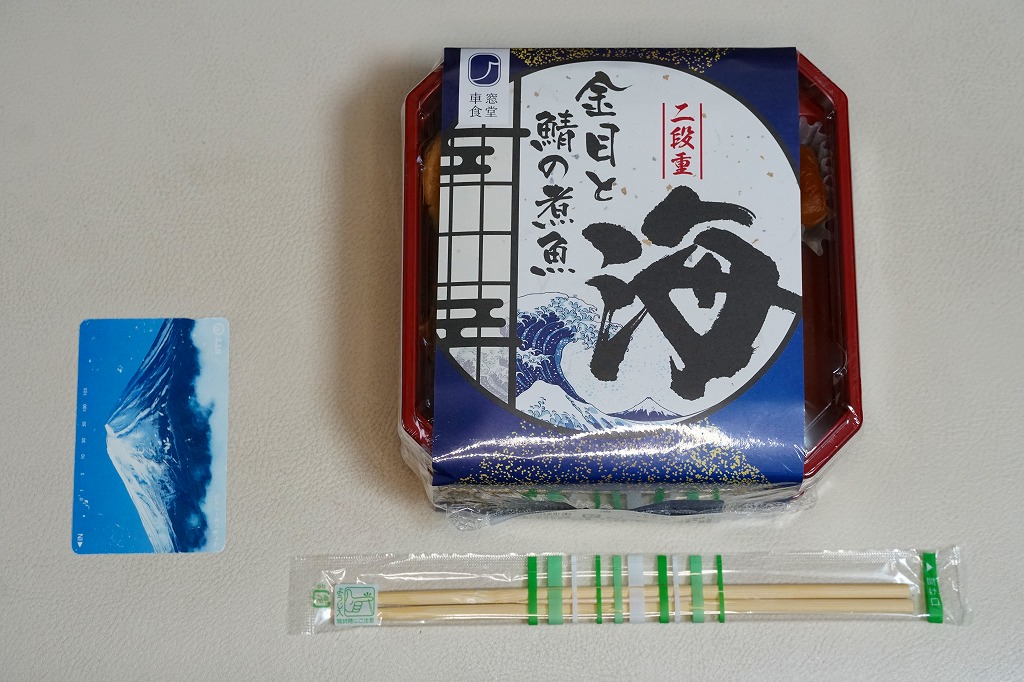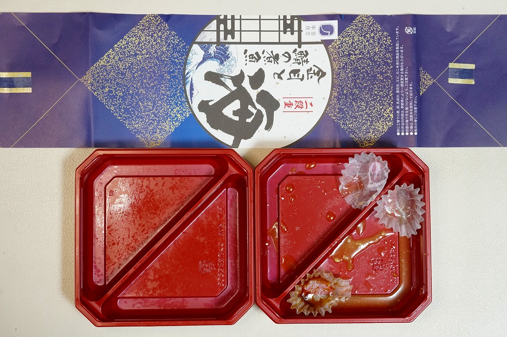 幕の内タイプの駅弁と考えると巨大な魚が2本も入る、お魚の、煮魚のお弁当。デパ地下で煮魚と御飯を買ってきたら同じものができそうで、惣菜が得意で駅弁では苦手な分野への挑戦に思える。タレや汁や脂が手指や掛紙やテーブルを汚さない、駅弁としての工夫があるのかもしれない。