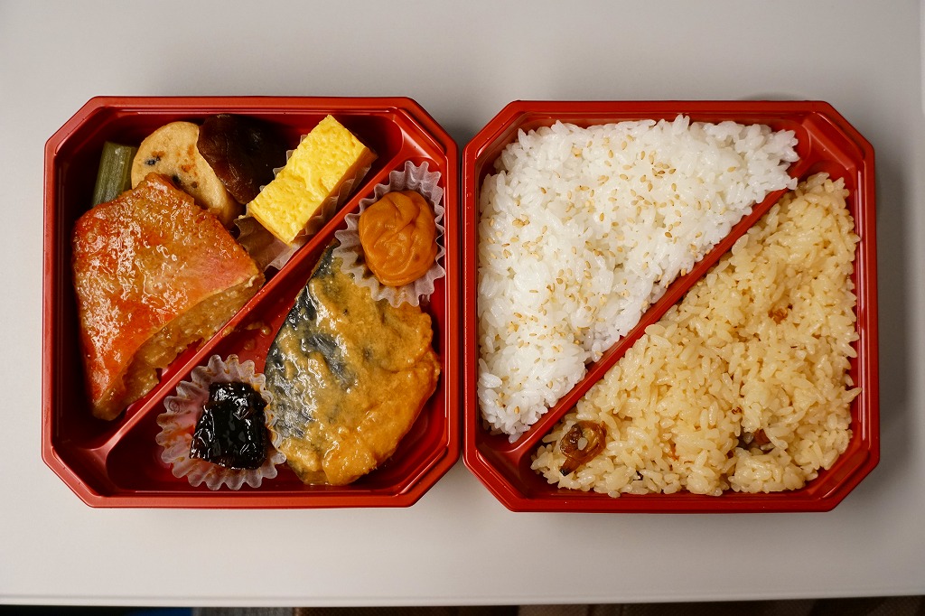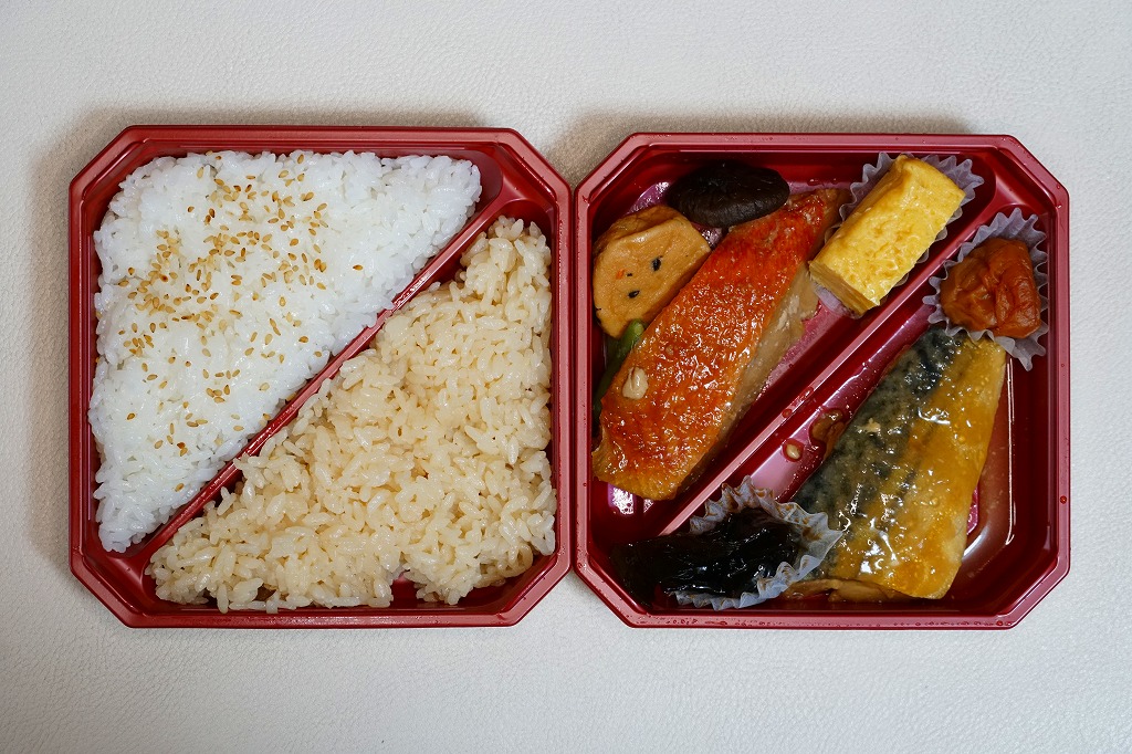 これは「海」で、公式な宣伝文は「だしと醤油でふっくらと煮上げた金目鯛の煮つけと、脂がのった鯖の優しい味わいの味噌煮が主役。ご飯は深川めしと白米の2種類、味付けの異なる2種類の煮魚が味わえる。」。小柄で浅く簡素な正方形大のプラ容器をふたつ重ね、波浪と漢字でブランドを描いたのだろう掛紙を巻く。中身は下段があさり御飯と白飯、上段がおかずで、キンメダイ煮付け、サバ味噌煮、玉子焼、がんもどき、梅干し、しいたけ、昆布佃煮、いんげん。