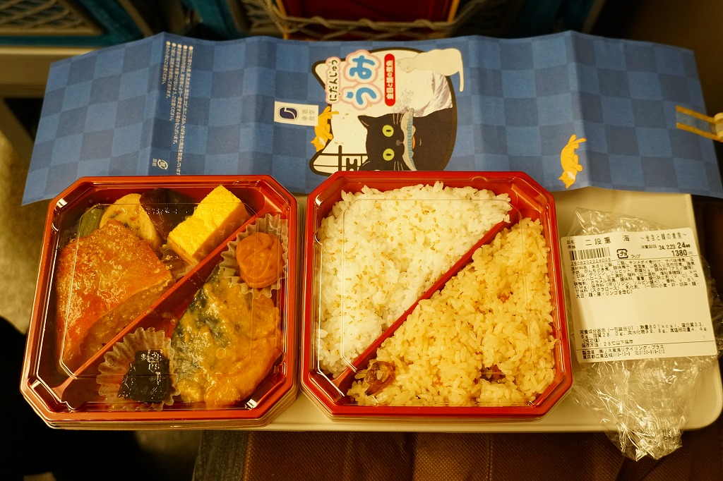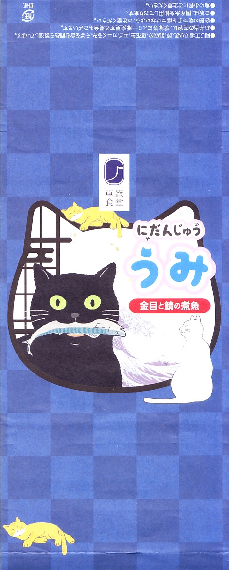 2024(令和6)年2月23日に購入した、東京駅弁の掛紙。調製元の「猫の日フェア」として、2024年2月6日から26日まで、既存の駅弁「二段重海金目と鯖の煮魚」の掛紙を、ネコのイラストに差し替えて販売した。中身と容器と値段は同じ。