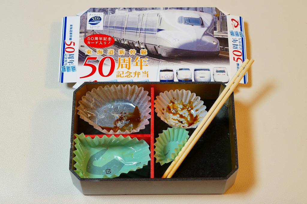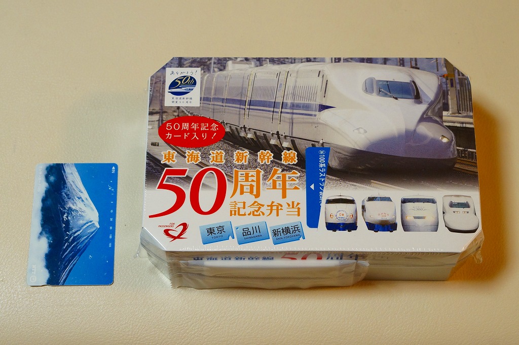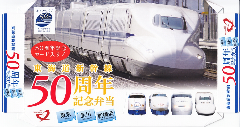 東海道新幹線の開業50周年を記念して、「東京・品川・新横浜」「名古屋」「京都・新大阪」の3種類を、2014(平成26)年4月1日から12月まで販売した記念駅弁。販売期間の前半と後半で異なるデザインのパッケージを使い、写真は後半版。さらに全50種類の中から1枚の記念カードを添付するという、東海道新幹線の駅弁では珍しく、コレクター仕様を取り入れている。