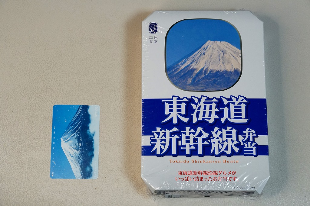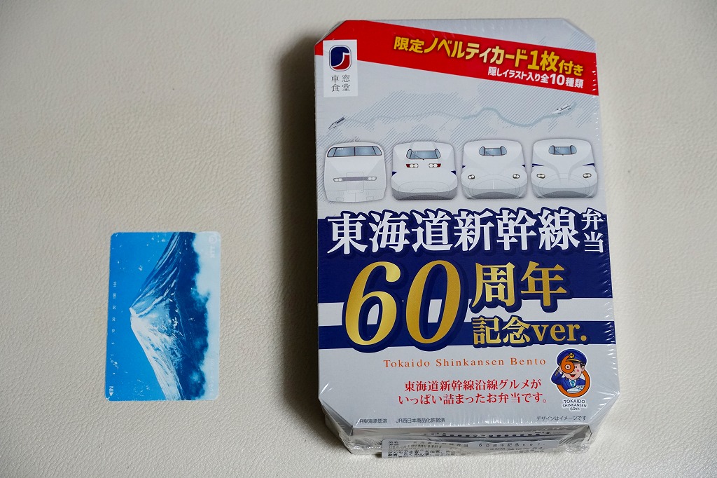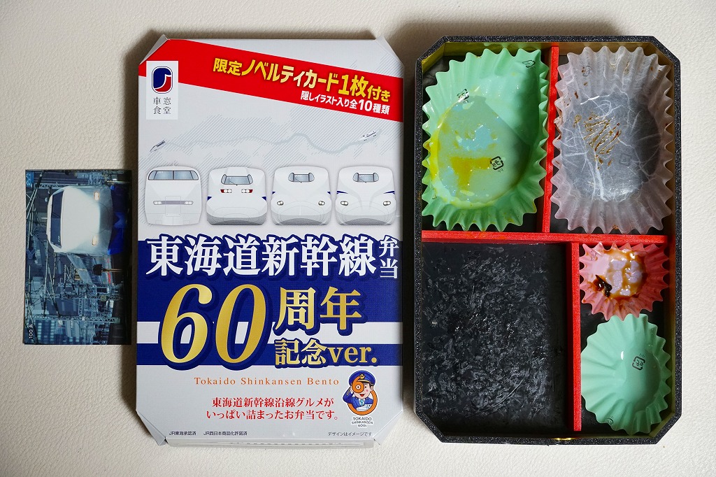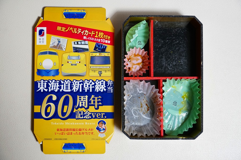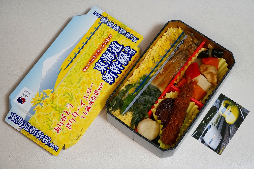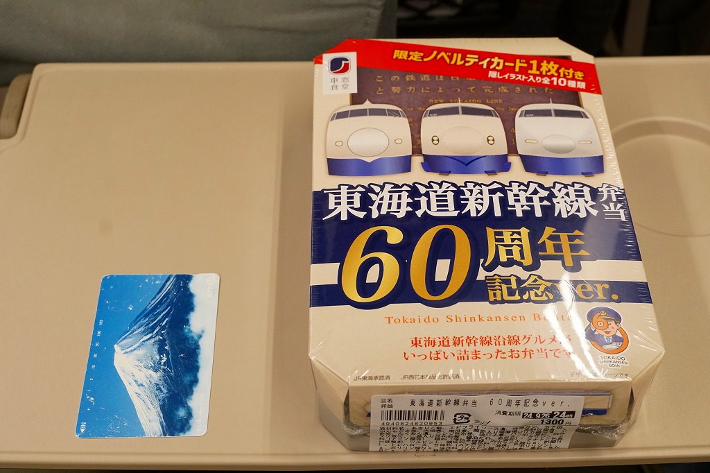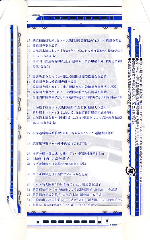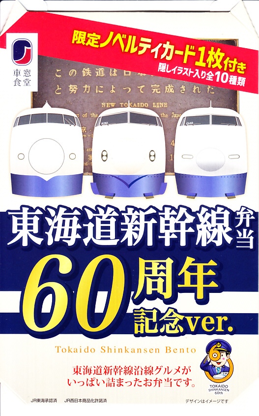 駅弁は普段の「東海道新幹線弁当」について、玉子焼に焼き印を入れ、エビフライを追加し、ノベルティカード全10種のうち1枚を添付し、パッケージ(ふた)を3期に分けて絵柄を変えて、価格を1,300円に上げて販売した。これはそのうち第1期。ふたの表面では東京駅のレリーフを背景に1000形と0系と100系の新幹線電車イラストを並べ、裏面には1956年から1964年までの東海道新幹線の年表を載せた。