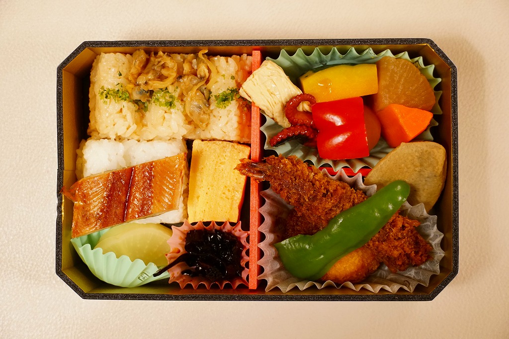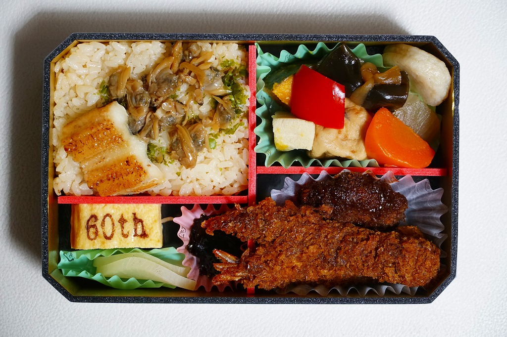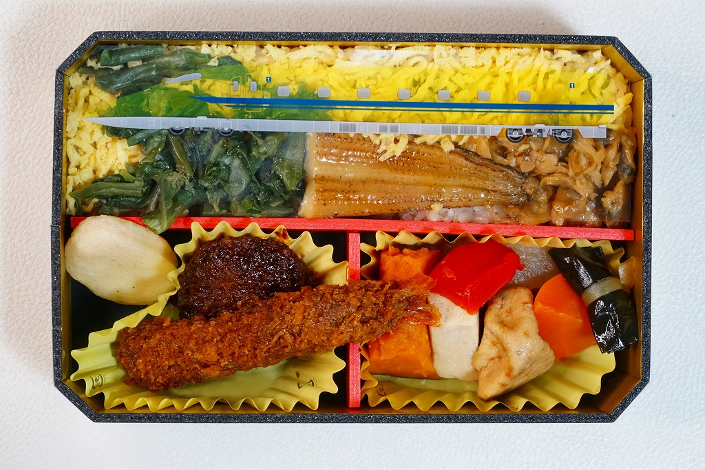 この「東京・品川・新横浜」バージョンの中身は、深川めしと白御飯の俵飯、アナゴ蒲焼、ワサビ昆布、べったら漬、エビフライ、みそかつ、イイダコ煮、50th焼き印の玉子焼、カボチャやニンジンなどの煮物など。箱にゆとりをもって、しかしスカスカにならずに、食材を立てて詰める、味も含めた立体感に美しさを感じる。
