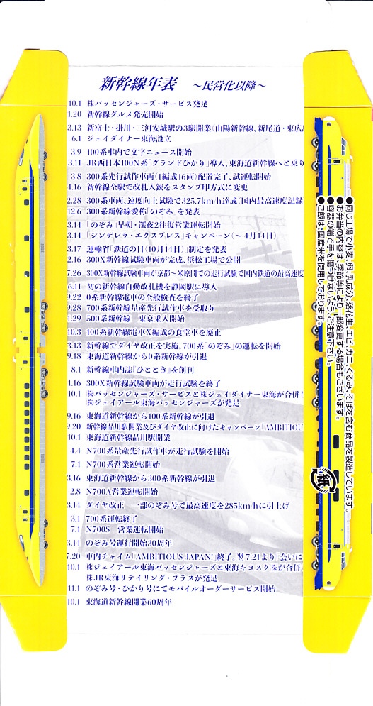上記の駅弁「東海道新幹線弁当60周年記念Ver.」の第2期。ふたの表面では東海道・山陽新幹線の路線図イメージを背景に300系と700系とN700系とN700S系の新幹線電車イラストを並べ、裏面には1965年から1987年までの東海道新幹線の年表を載せた。JR西日本の500系も路線図の片隅に小さく登場。中身は第1期と変わらない。この第2期は10月10日から予定の販売期間を超えて、名古屋で10月23日まで、その他の駅で10月25日まで販売された。