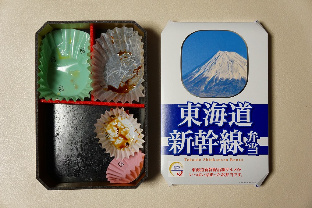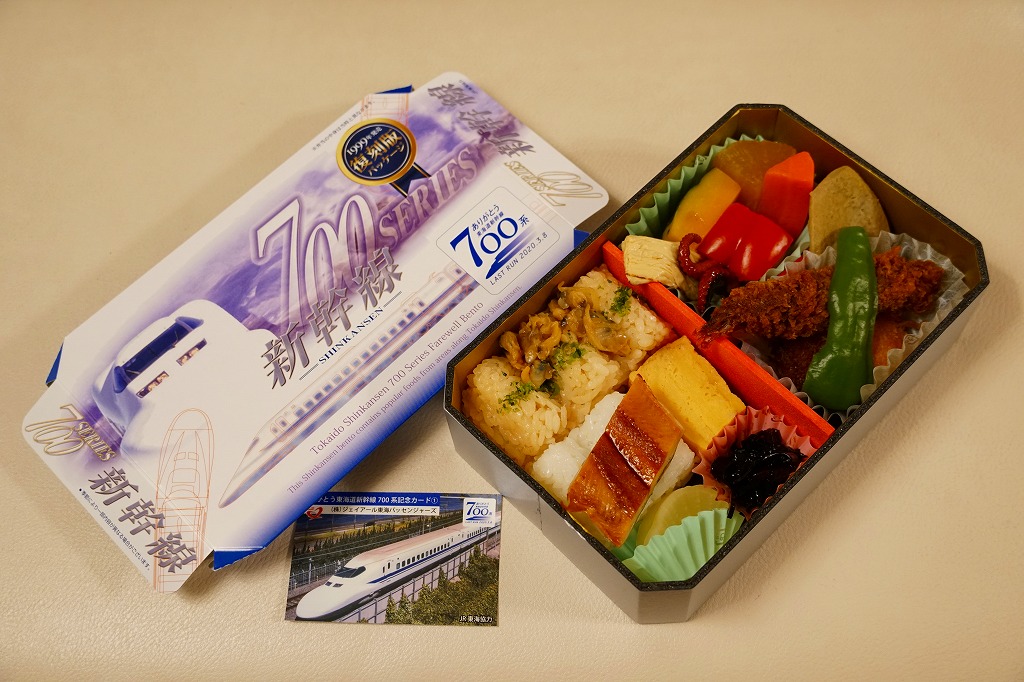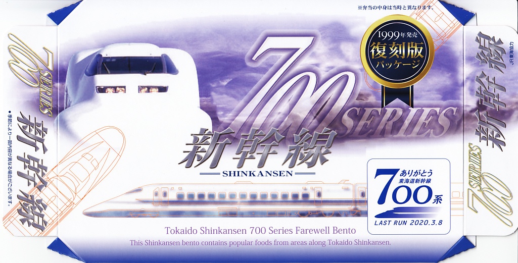 2020(令和2)年1月8日に購入した、東京駅弁のふた。同年3月の東海道新幹線からの700系新幹線電車の撤退に合わせ、同年の1月上旬から3月中旬までの予定で販売された記念駅弁。中身は普段の「東海道新幹線弁当」と同じで、紙ぶたの絵柄を同電車の1999(平成11)年のデビュー当時に売られた駅弁のものとし、「ありがとう東海道新幹線700系記念カード」6種類中1枚を封入した。