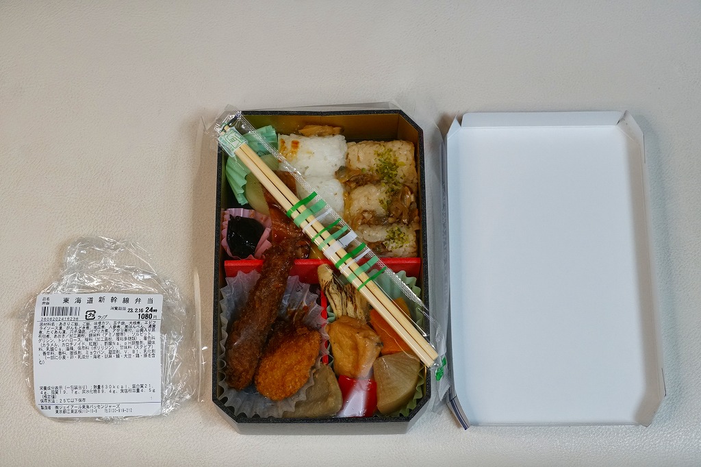 中身はあさりご飯に焼きアナゴ煮を載せ、煮物の数々と薩摩揚げ、味噌カツとエビフライ2本、玉子焼と海苔佃煮とたくあん。記念のふたを楽しむのもよし、ちょっと値上げした東名阪の駅弁を食事とするもよし。この第1期は9月24日から10月9日まで販売された。