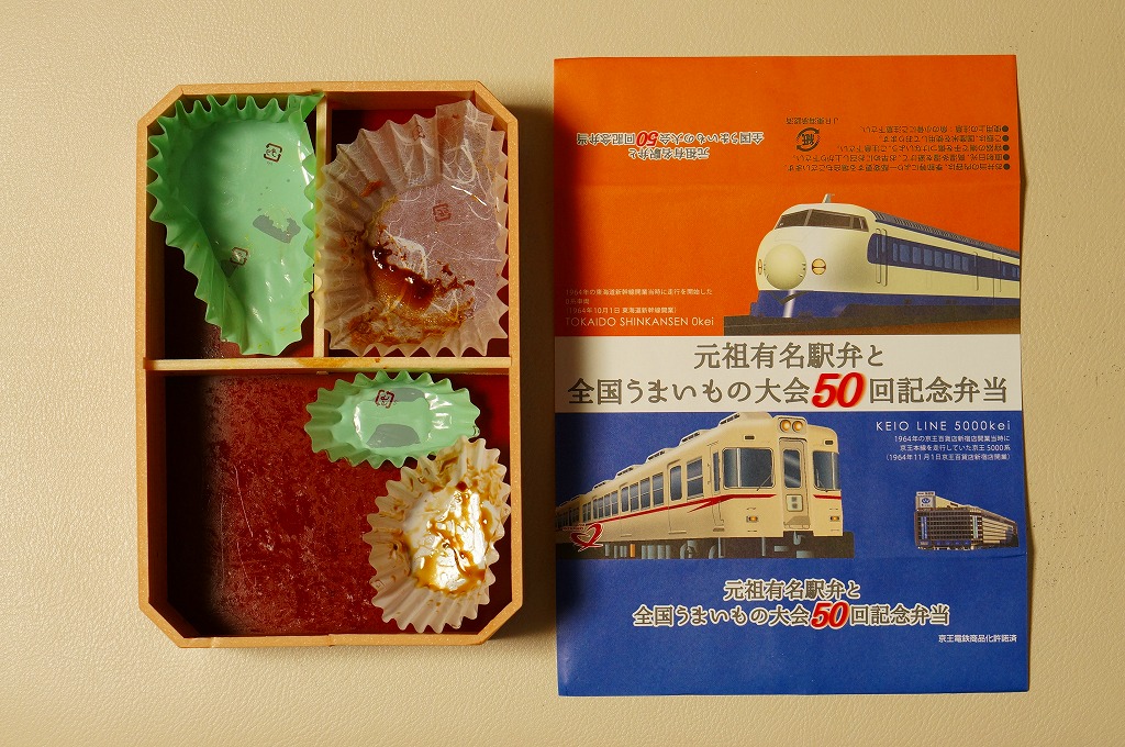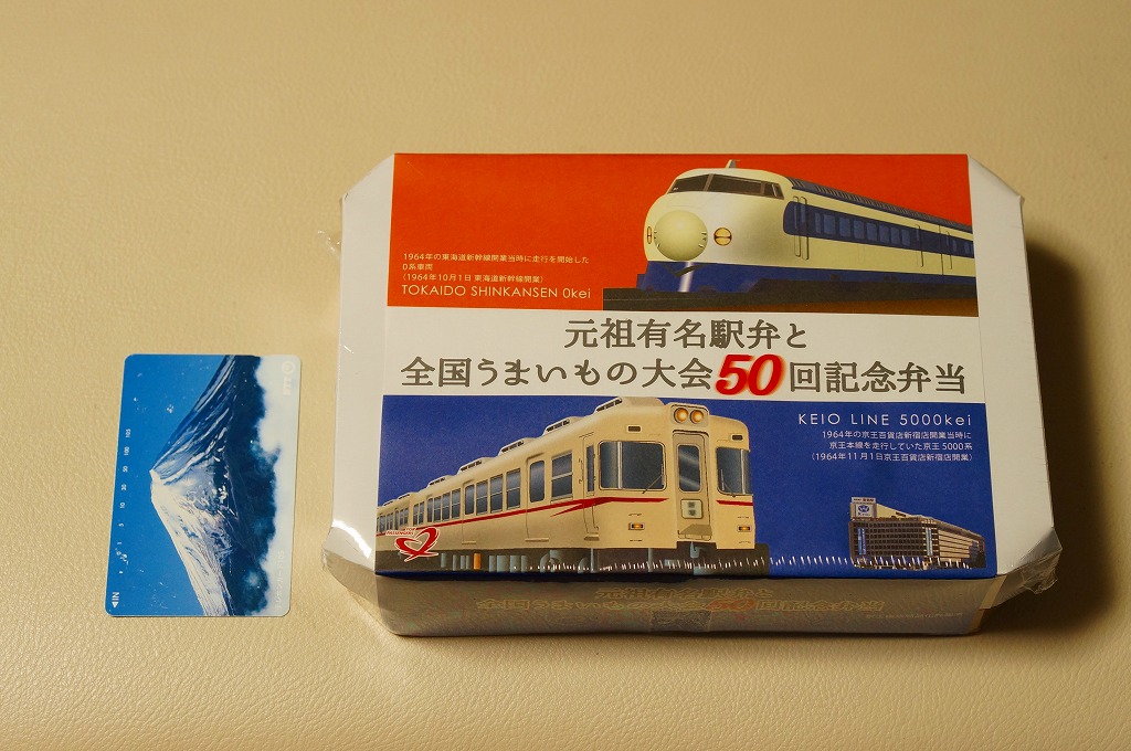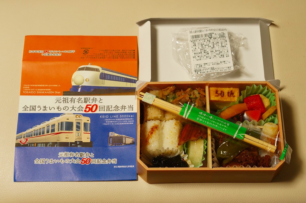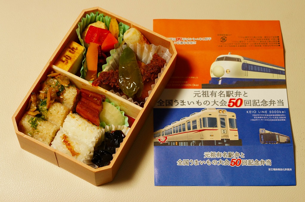 2015(平成27)年1月の京王百貨店の駅弁大会で、東京駅弁として売られたお弁当。掛紙は1964(昭和39)年デビューの東海道新幹線0系電車と、1963(昭和38)年デビューの京王帝都電鉄(当時)5000系電車のイラスト。毎年一度の駅弁大会の第50回記念ということで、50年前の調製元と百貨店親会社の花形車両を掛紙で並べた。中身は下記「東海道新幹線50周年記念弁当」と同じ。「50th」と焼き印した玉子焼も、そのままの姿で収まる。