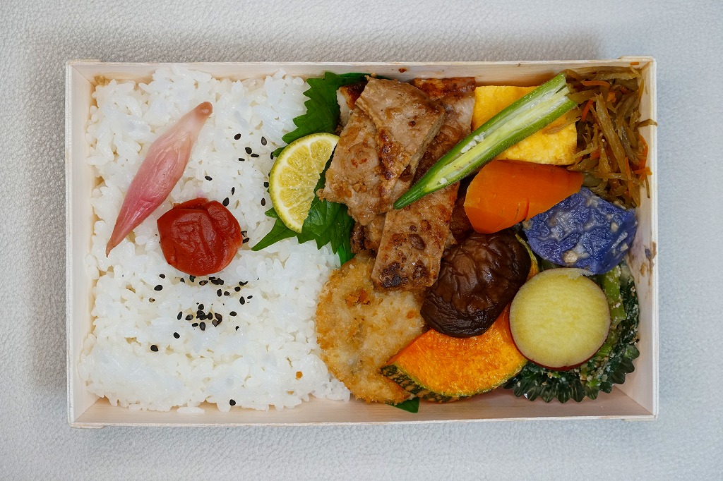 長方形の木質エコ容器の、半分に白飯を詰め、しその葉を介した残る半分に豚肉、れんこん揚げ、かぼちゃやしいたけなどの煮物、ささがきごぼう、玉子焼、さつまいも、小松菜などを折り重ねる。調製元は町田市内でも、町田駅から相模原市を介してはるか遠くの相原町とある。「里山ごはん」の名にふさわしい、それぞれの食材に存在感のあるお弁当だった。