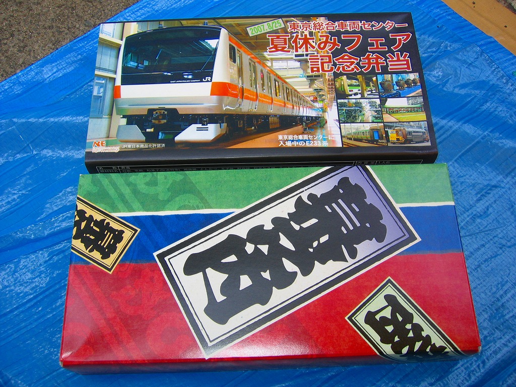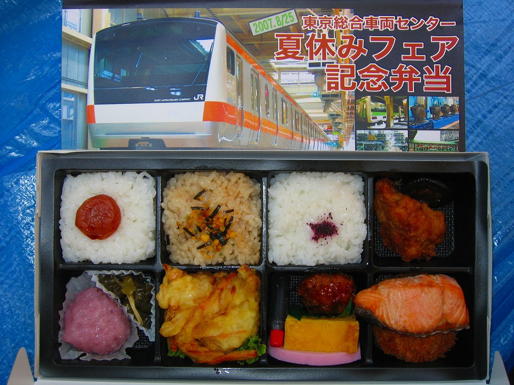 2007(平成19)年8月25日の鉄道工場公開イベントで販売されたお弁当。調製はNREで、新型電車の写真を載せた掛紙の下には見慣れた絵柄の紙箱があり、中身は日の丸御飯、ゆかり白飯、玉子ふりかけ御飯、鳥唐揚、焼鮭ととんかつ、蒲鉾と卵焼きとミートボール、野菜かき揚、桜道明寺など。東京駅その他に同種商品はないと思うが、上のように同時開催の江戸東京博物館での鉄道展では中身がほぼ同じ弁当が売られており、こういうレシピを記念駅弁用で持っているのだろう。ここでは他にもNREの東京駅弁などが販売されていた。