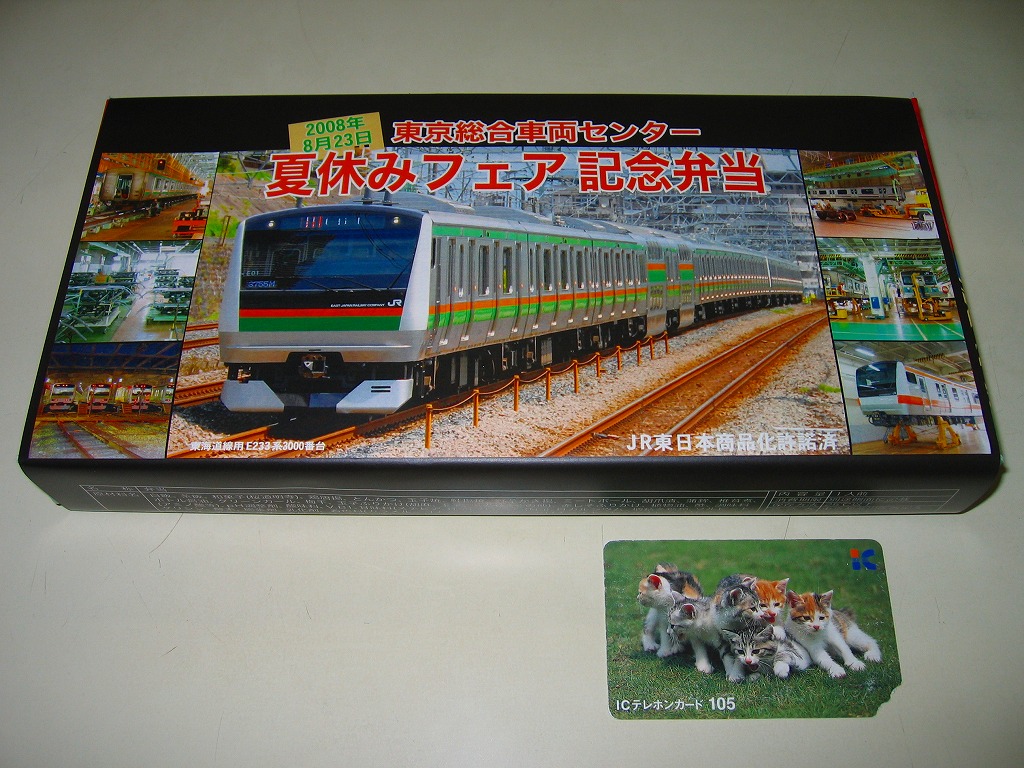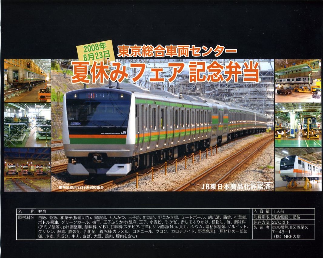 2008(平成20)年8月23日の鉄道工場公開イベントで販売されたお弁当。調製はNREで、今年は東海道線に1編成だけ投入されたE233系3000番台電車の写真を掛紙に採用した。中身や価格およびボール紙製の容器は昨年と同じ。今年も多くの家族連れと鉄道ファンで賑わっていた。