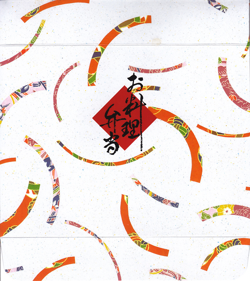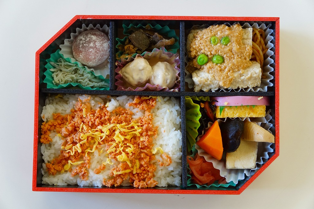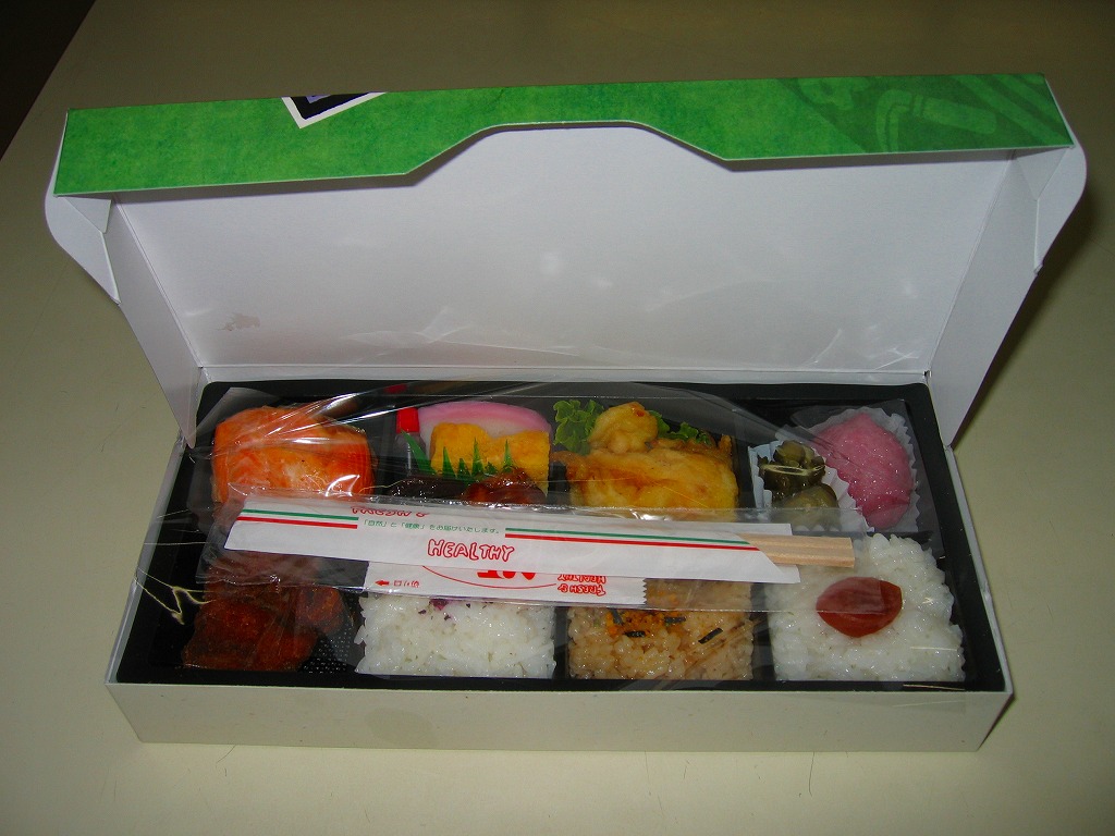 中身は普段「味だより」の名称でNREが受注生産している宅配弁当。大きな正方形の容器に9区画の黒いプラ製トレーを入れ、その中身は日の丸御飯、玉子ふりかけ茶飯、梅ふりかけ御飯、かまぼこと玉子焼と鮭塩焼、海老焼売と春雨サラダ、とうふステーキとマイタケ天、シイタケや根菜などの煮物、トンカツにウインナー、春巻にエビチリ。